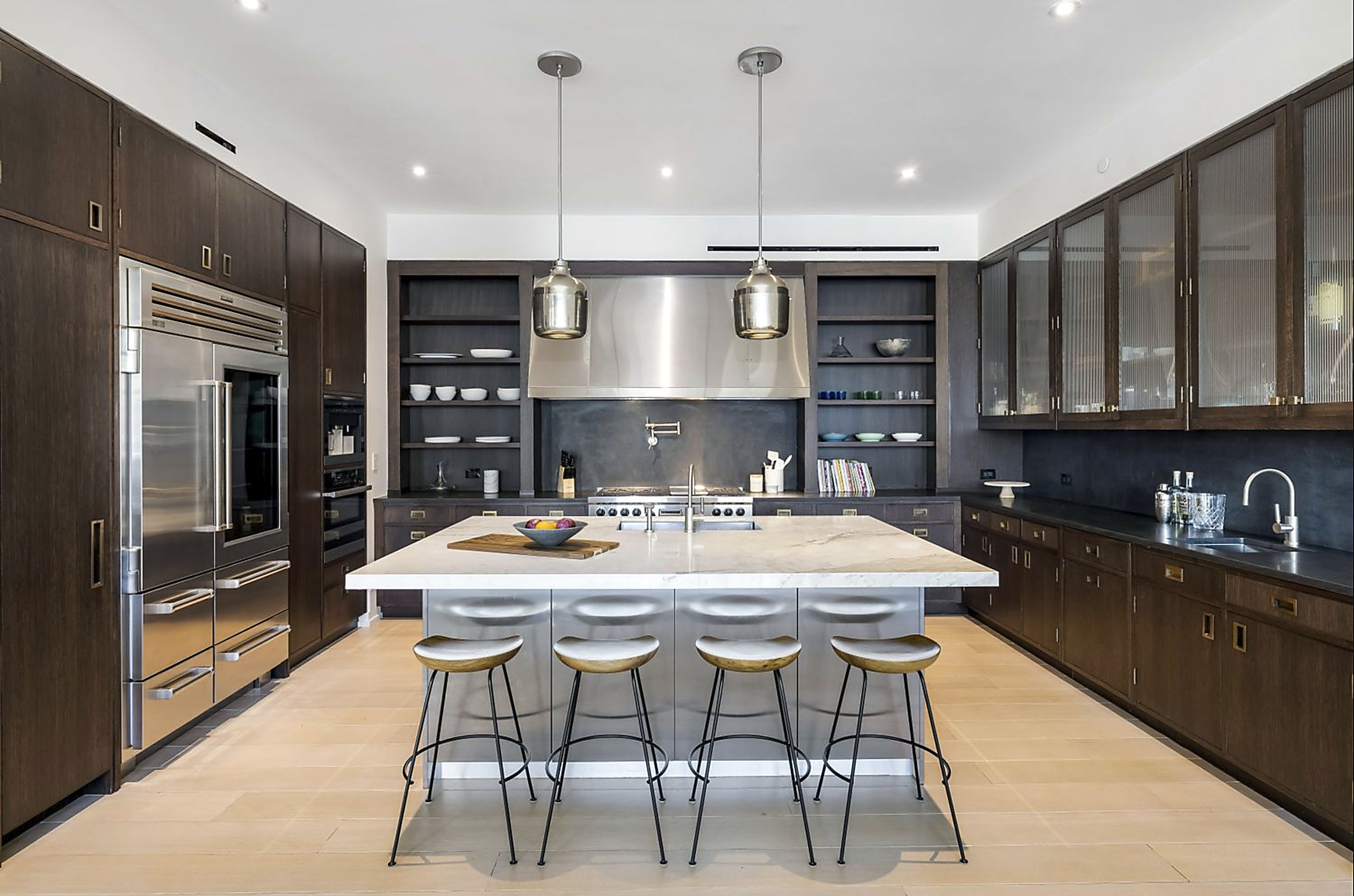 La cocina de chef abierta de última generación, diseñada por Christopher Peacock, está situada fuera del área de comedor.