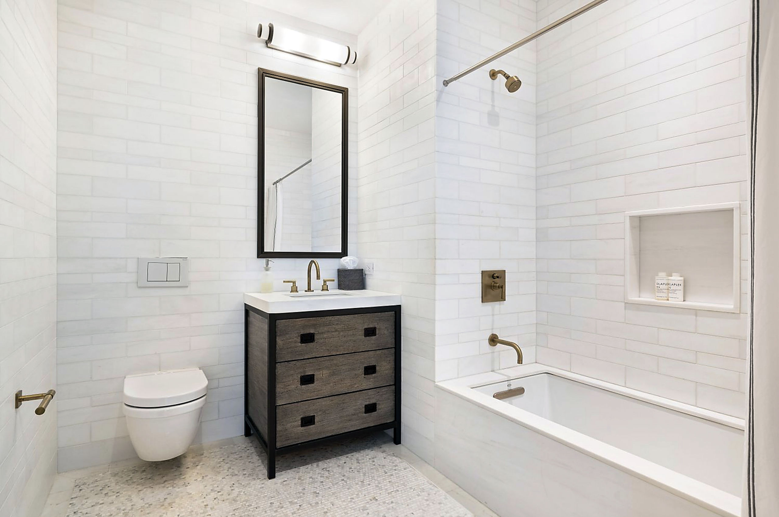 El elegante y sereno baño en suite, con pisos radiantes con calefacción, está revestido de mármol blanco de Calacuta y tiene un tocador doble, bañera de huevo independiente, ducha de vidrio de gran tamaño con banco de piedra y cabezal de ducha.