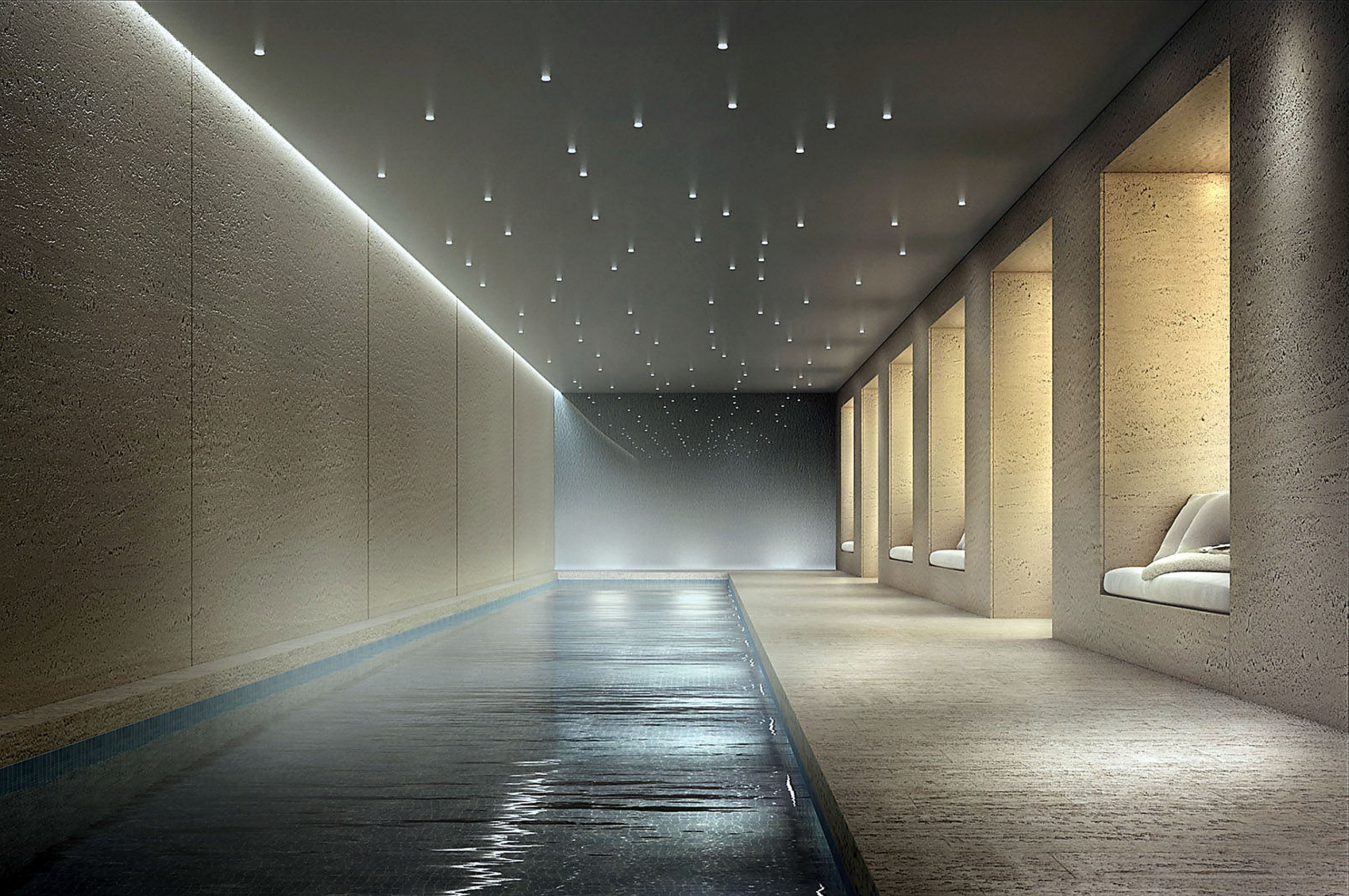 El loft incluye portero y conserje las 24 horas, piscina cubierta de 70 pies, gimnasio con estudios privados de yoga/pilates, sauna de infrarrojos, sala de masajes, hammam turco, sala de juegos para niños, terraza en la azotea con jardines de 5000 pies cuadrados, porteros, gerente residente interno...