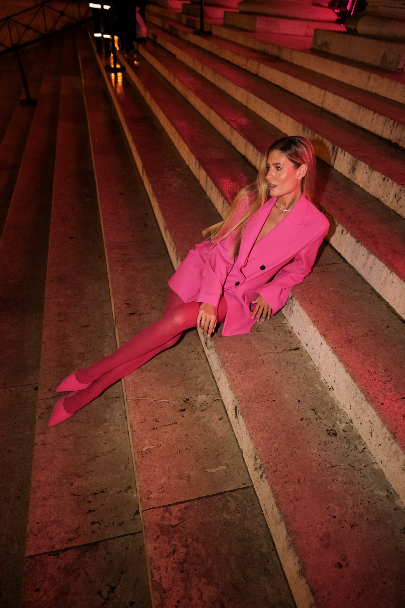 La influencer Teresa Andrés Gonzalvo, que se olvidó del negro que vistió la mayoría y apostó por un 'total look' rosa.
