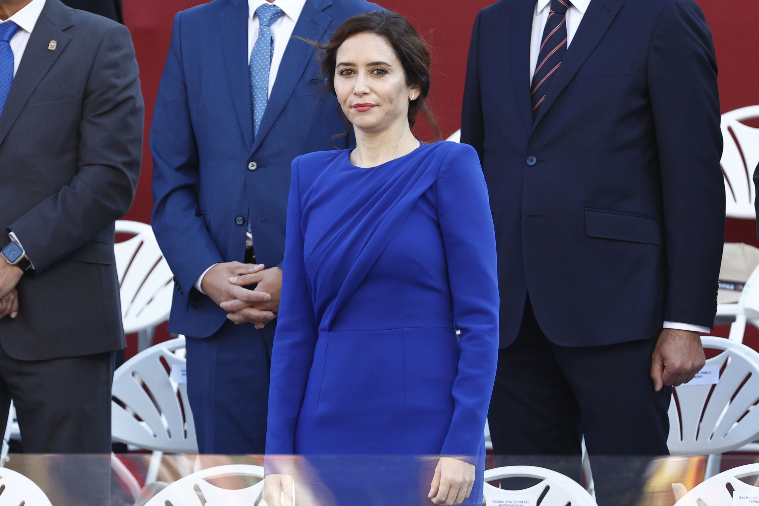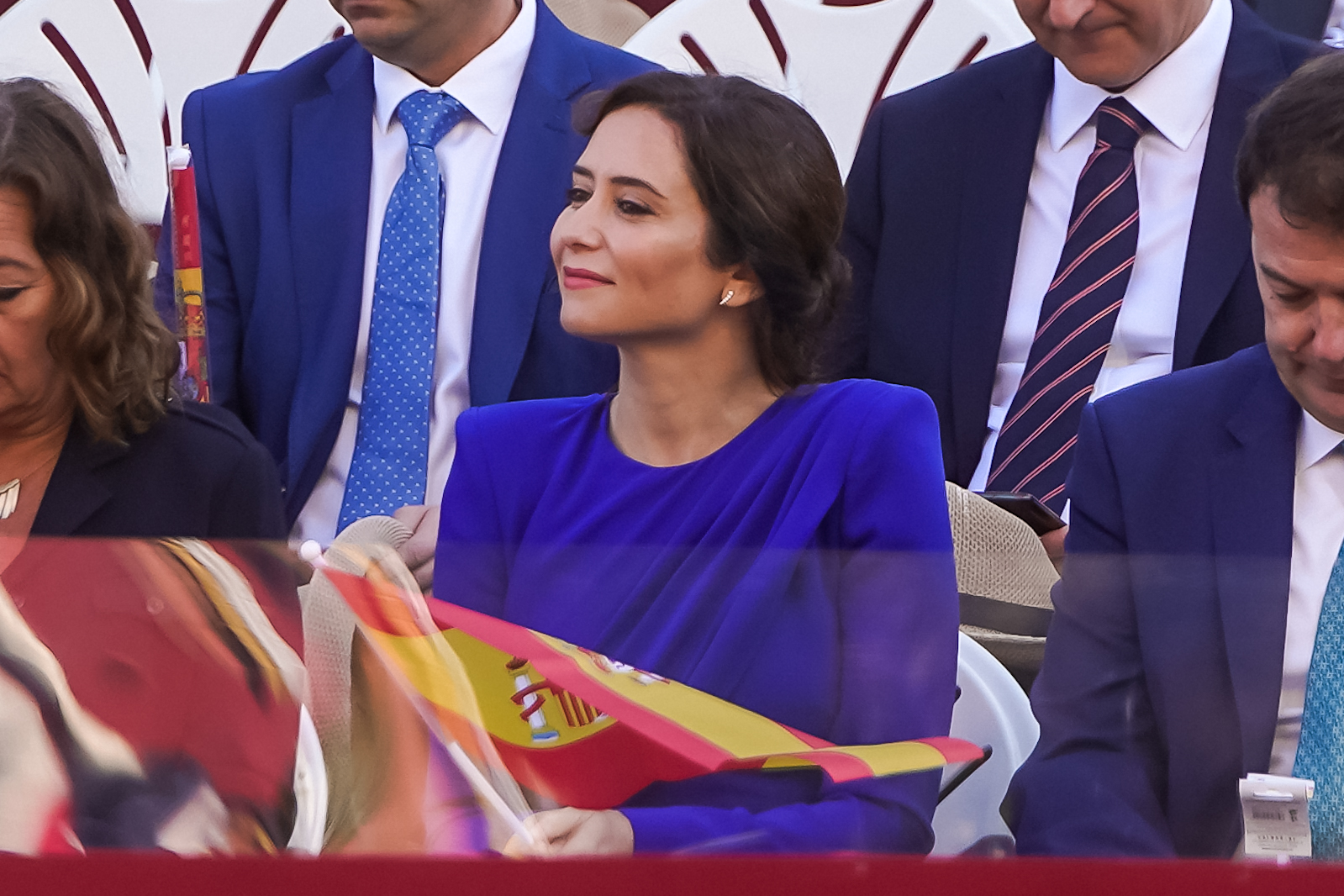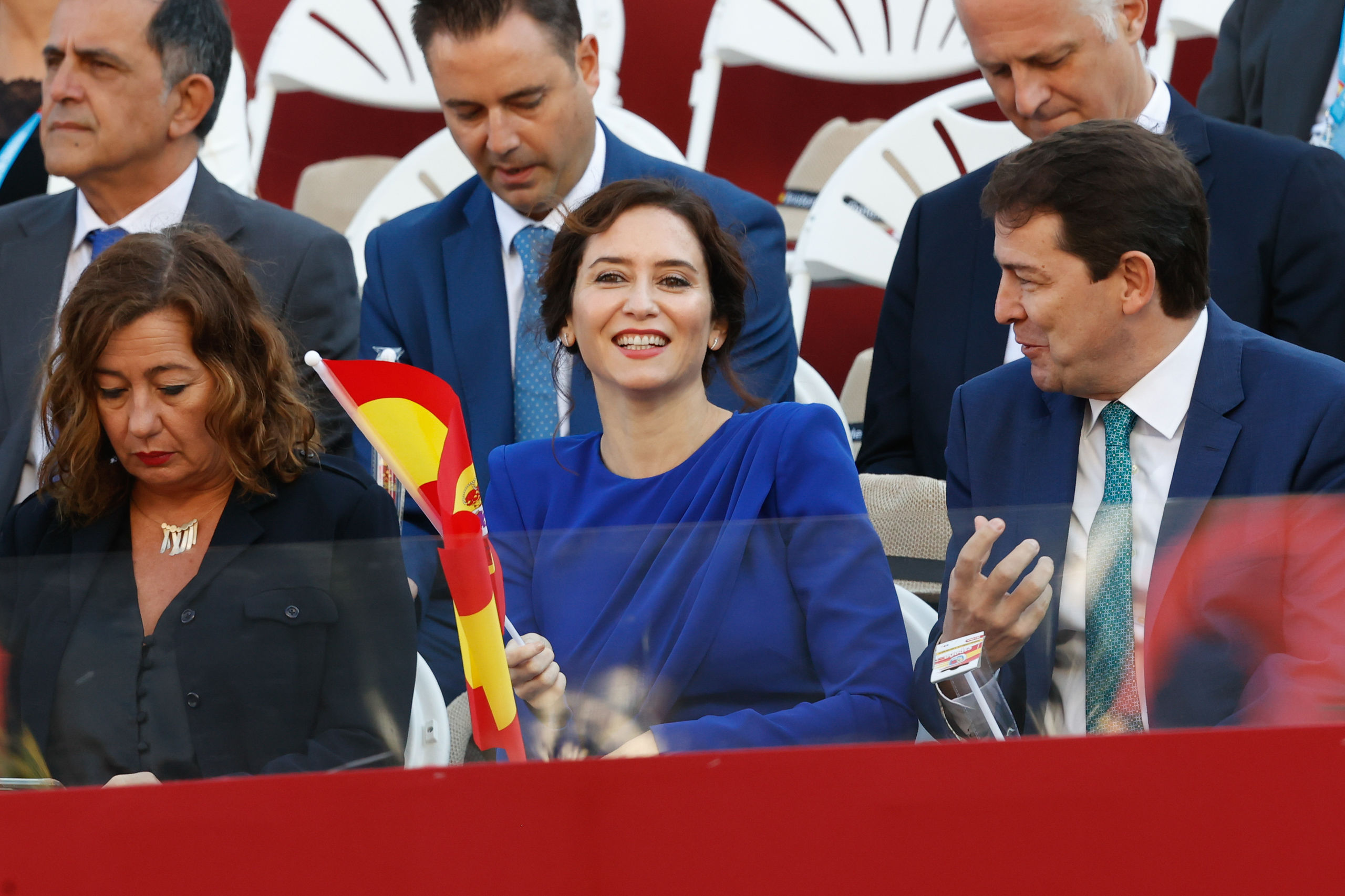 La presidenta de la Comunidad de Madrid, esperando a que dé comienzo el desfile junto al resto de presidentes autonómicos.