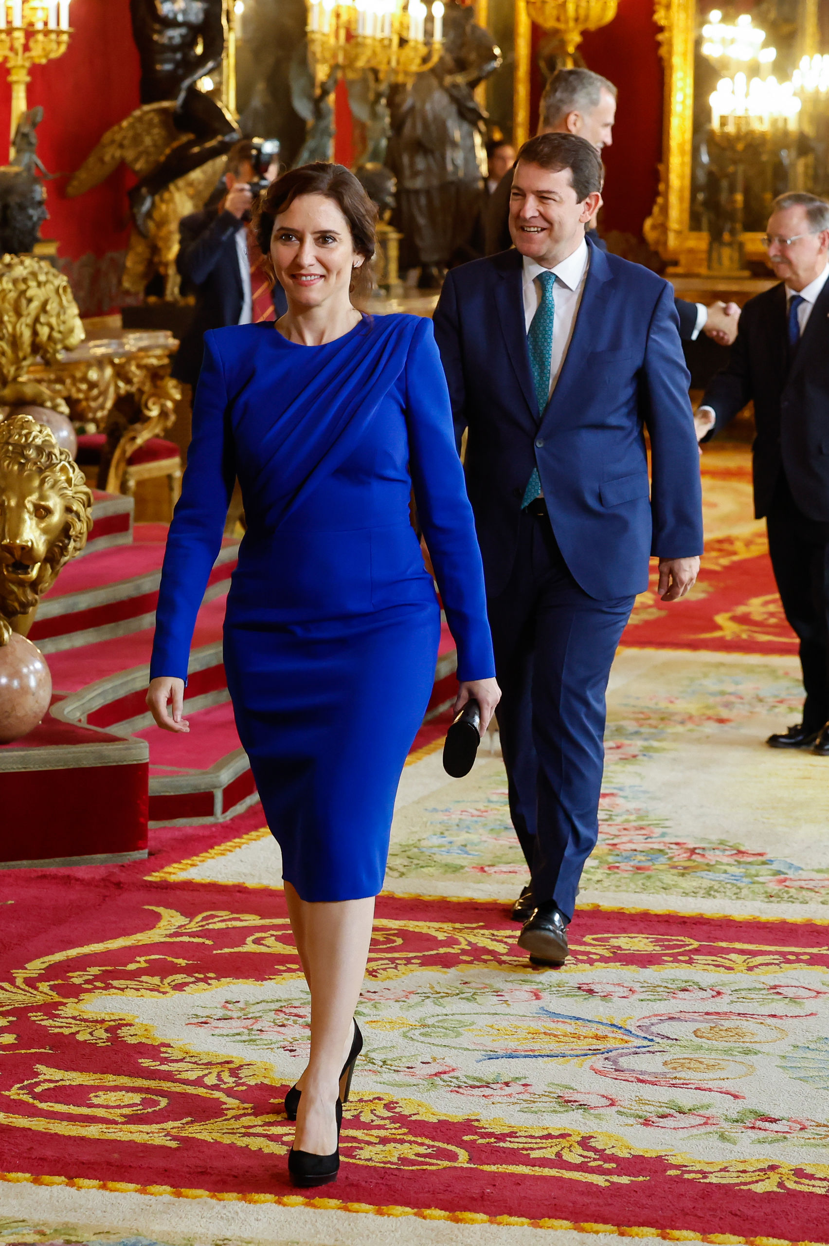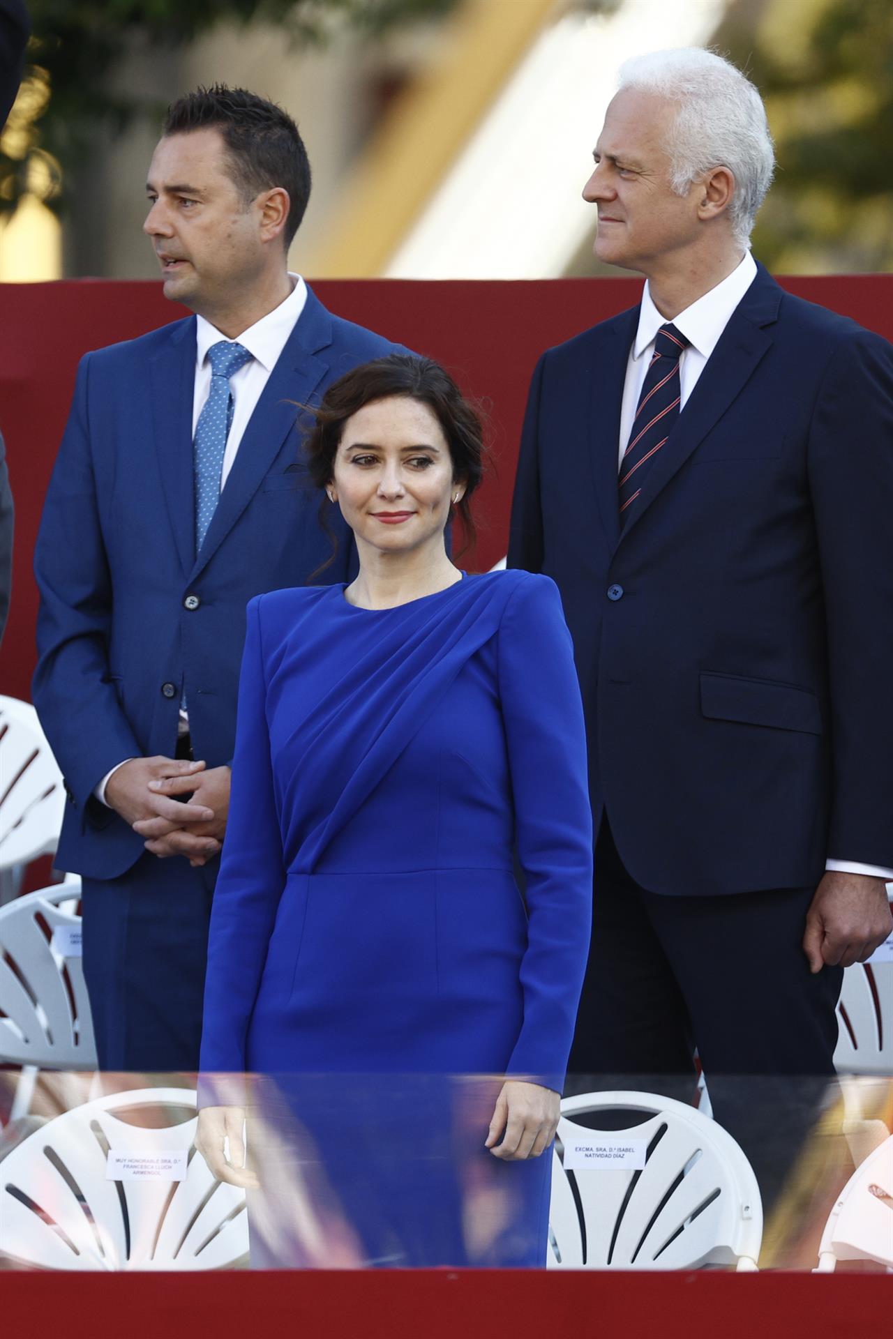 Isabel Díaz Ayuso decidió lucir este año un vestido azul para el desfile del Día de la Hispanidad y la posterior recepción de los Reyes en el Palacio Real. La presidenta de la Comunidad de Madrid suele vestir de rojo en las grandes ocasiones como guiño a la bandera de Comunidad de Madrid, como hizo en 2021, cuando vistió un traje de chaqueta y falda de tubo en este color.