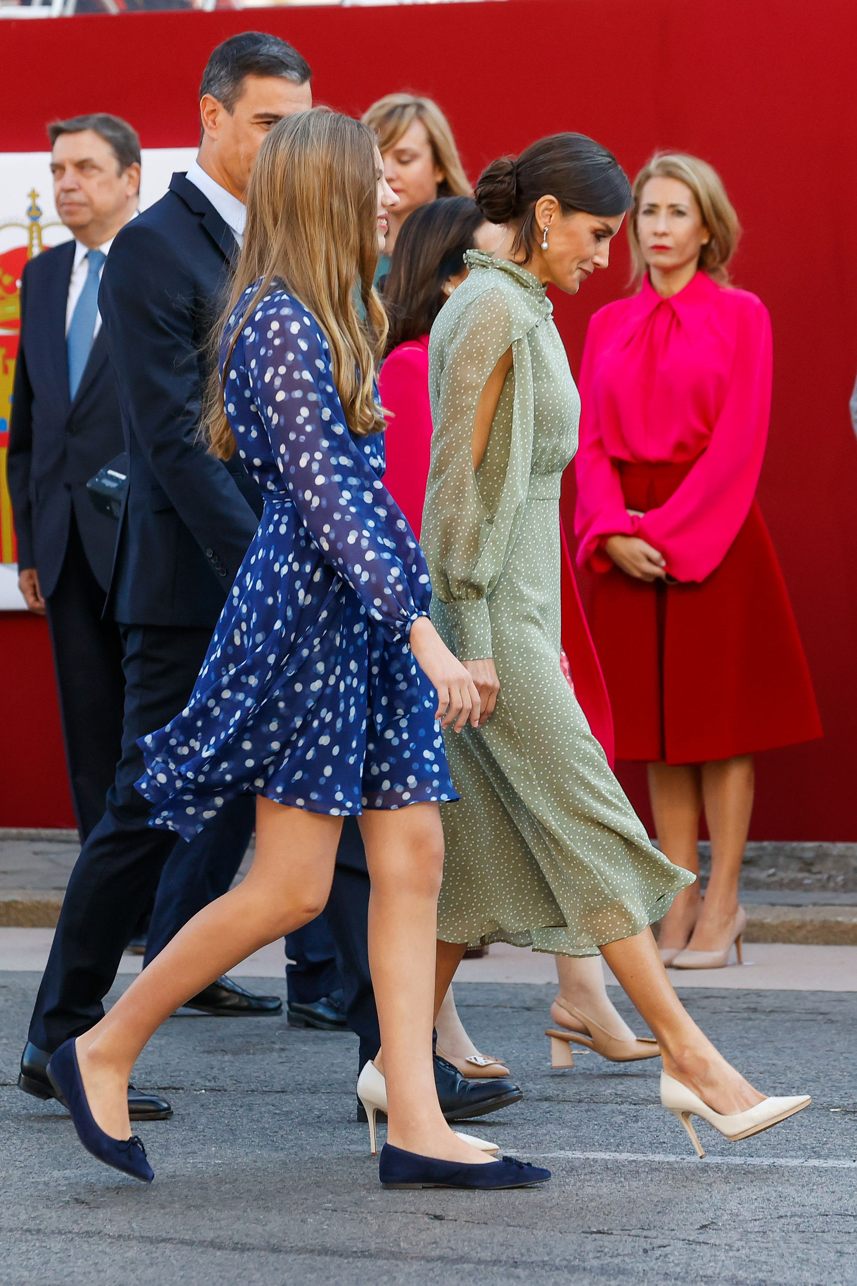 Madre e hija vistieron vestidos estampados con lunares, aunque de distinto tamaño y color. Mientras doña Letizia optó por unos altísimos tacones, la hija menor de los Reyes se sigue resistiendo a usarlos.
