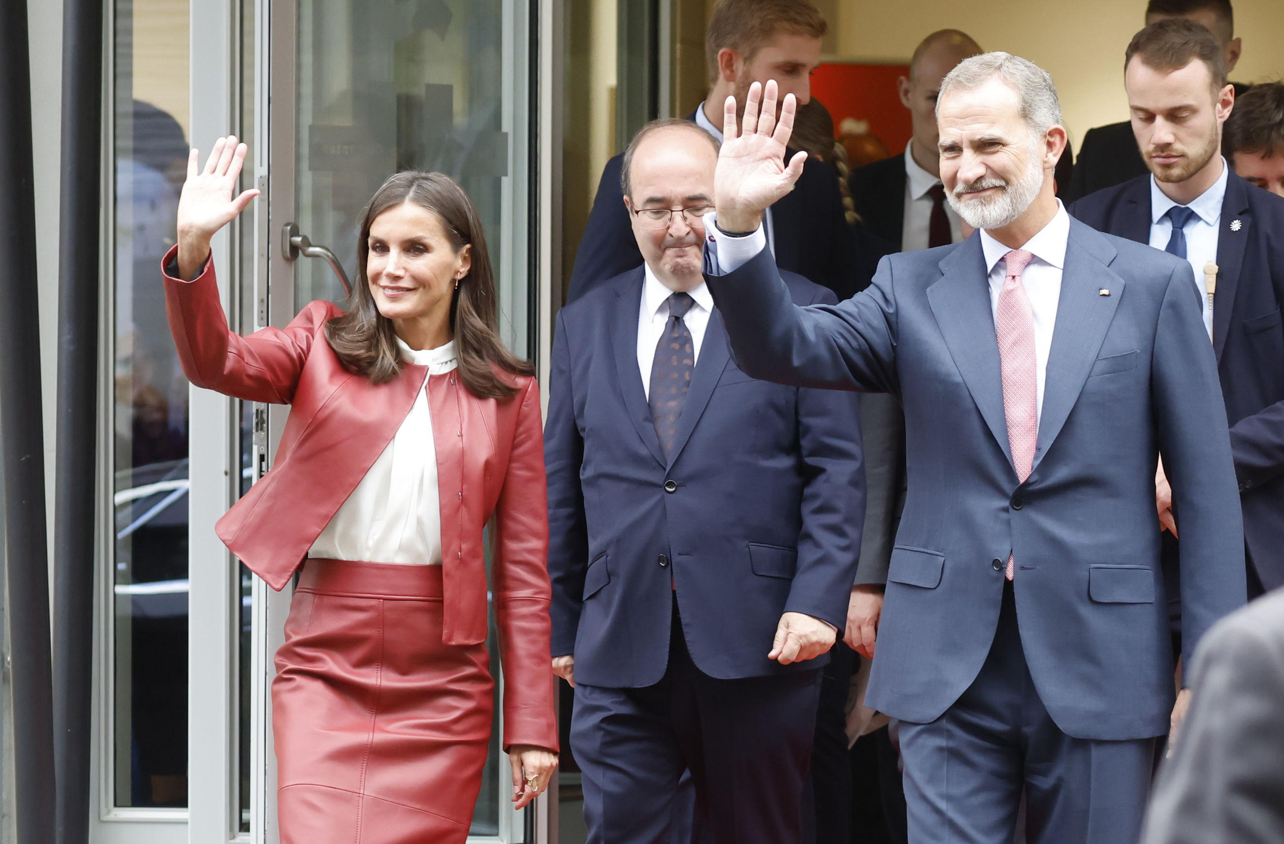 Los Reyes, a la salida del Instituto Cervantes de Frankfurt acompañados por el ministro de Cultura y Deporte, Miquel Iceta.