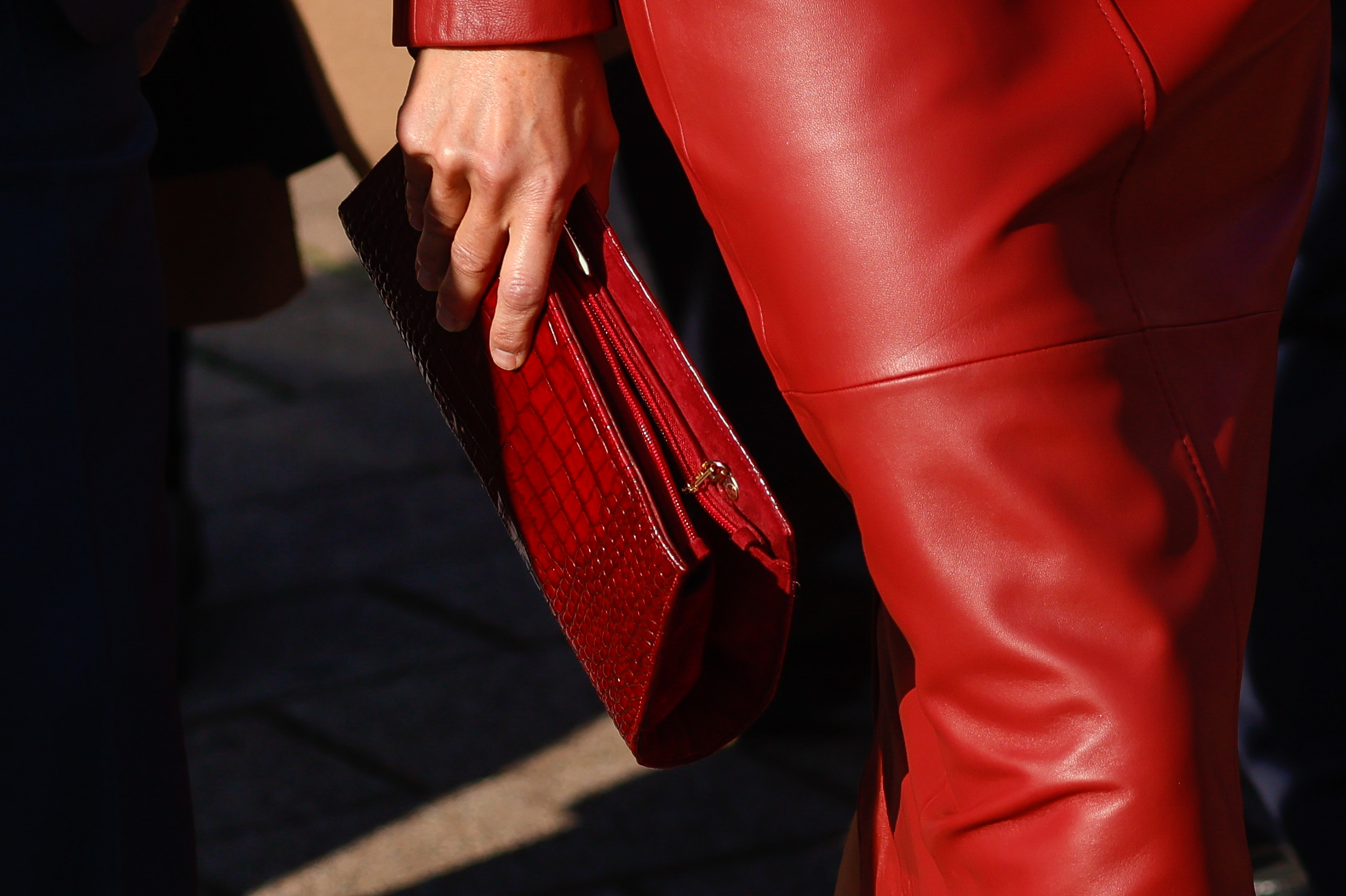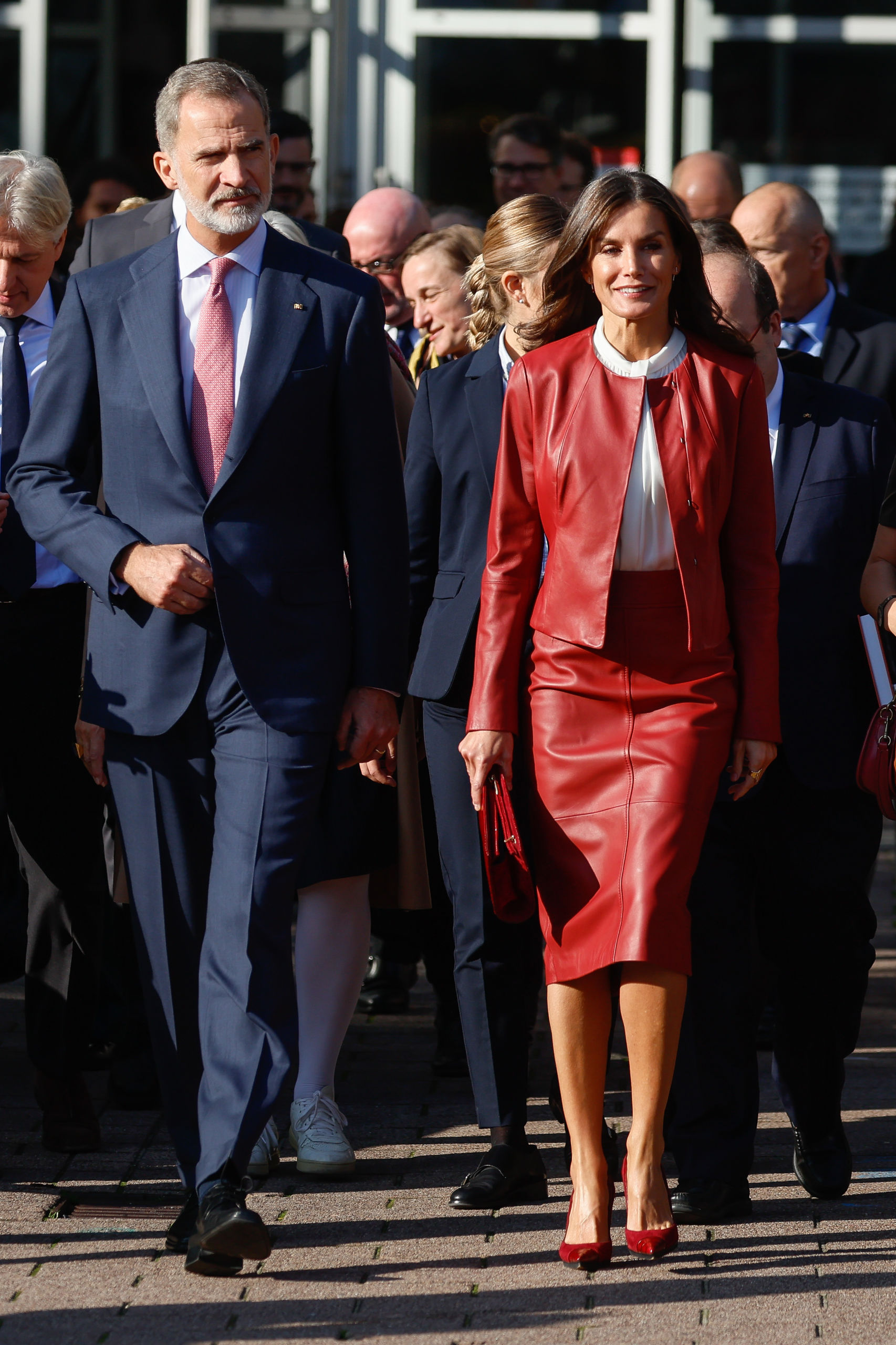La reina Letizia volvió a escoger la firma alemana Hugo Boss para las citas de este miércoles. La monarca lució un conjunto de cuero rojo cuya falda de silueta lápiz ya había estrenado en 2019 durante el viaje a Corea del Sur. Los tacones, también rojos y de ante con puntera de piel, son de Magrit.