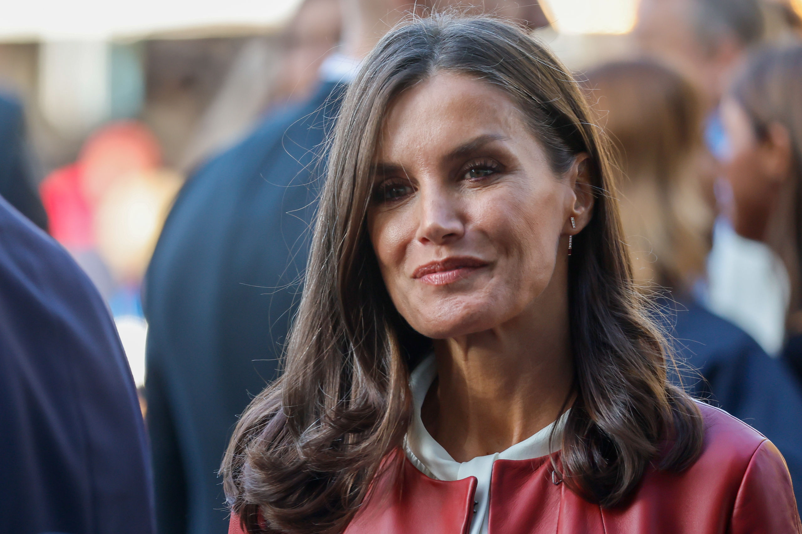 Doña Letizia estrenó en público la cazadora de cuello redondo que conjunta con la falda y combinó el traje con una blusa blanca de Carolina Herrera.