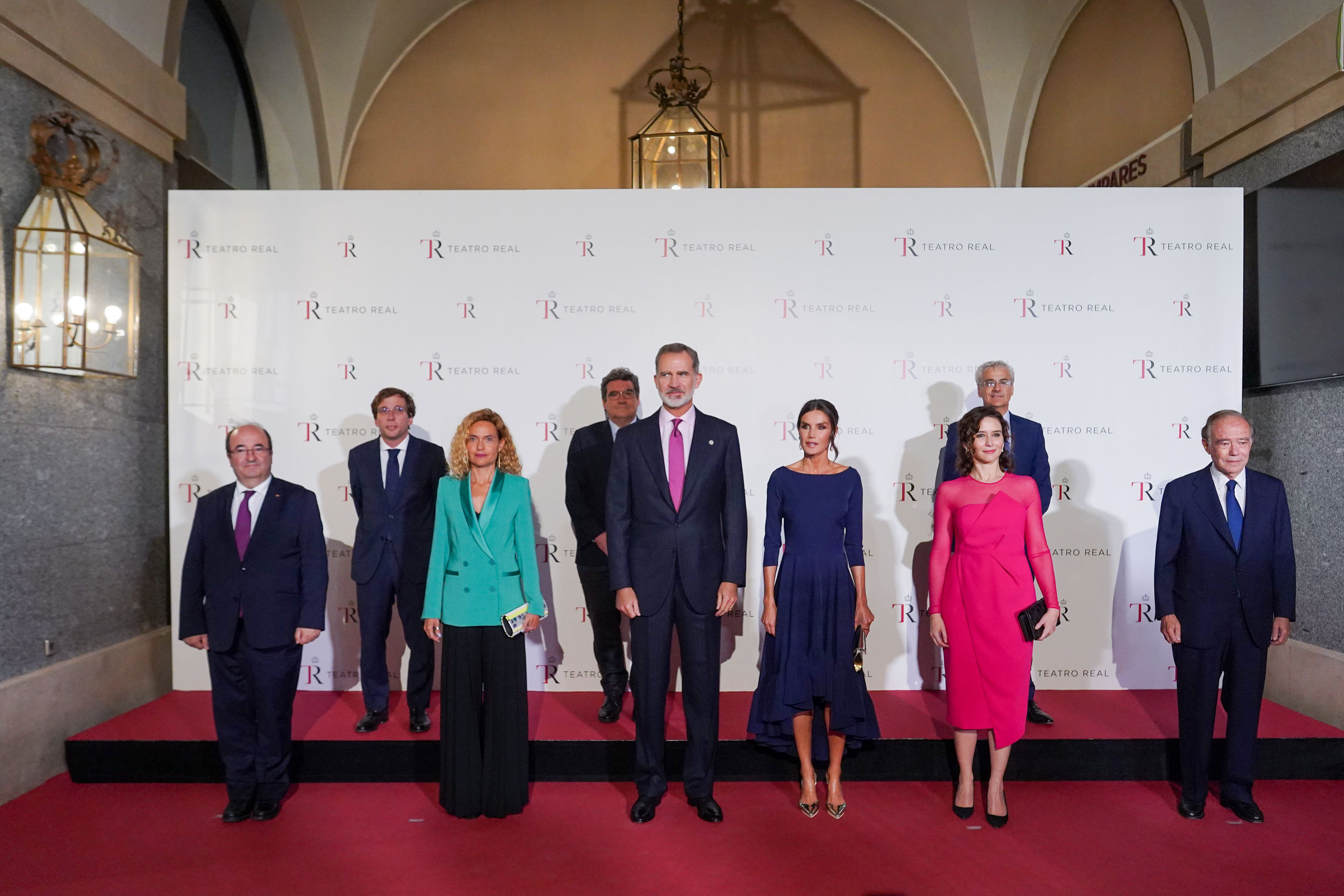 Don Felipe y doña Letizia, junto al ministro de Cultura y Deporte, Miquel Iceta; el alcalde de Madrid, José Luis Martínez-Almeida; la presidenta del Congreso de los Diputados, Meritxell Batet; la presidenta de la Comunidad de Madrid, Isabel Díaz Ayuso, el ministro de Seguridad Social, José Luis Escrivá, y el presidente del Teatro Real, Gregorio Marañón.