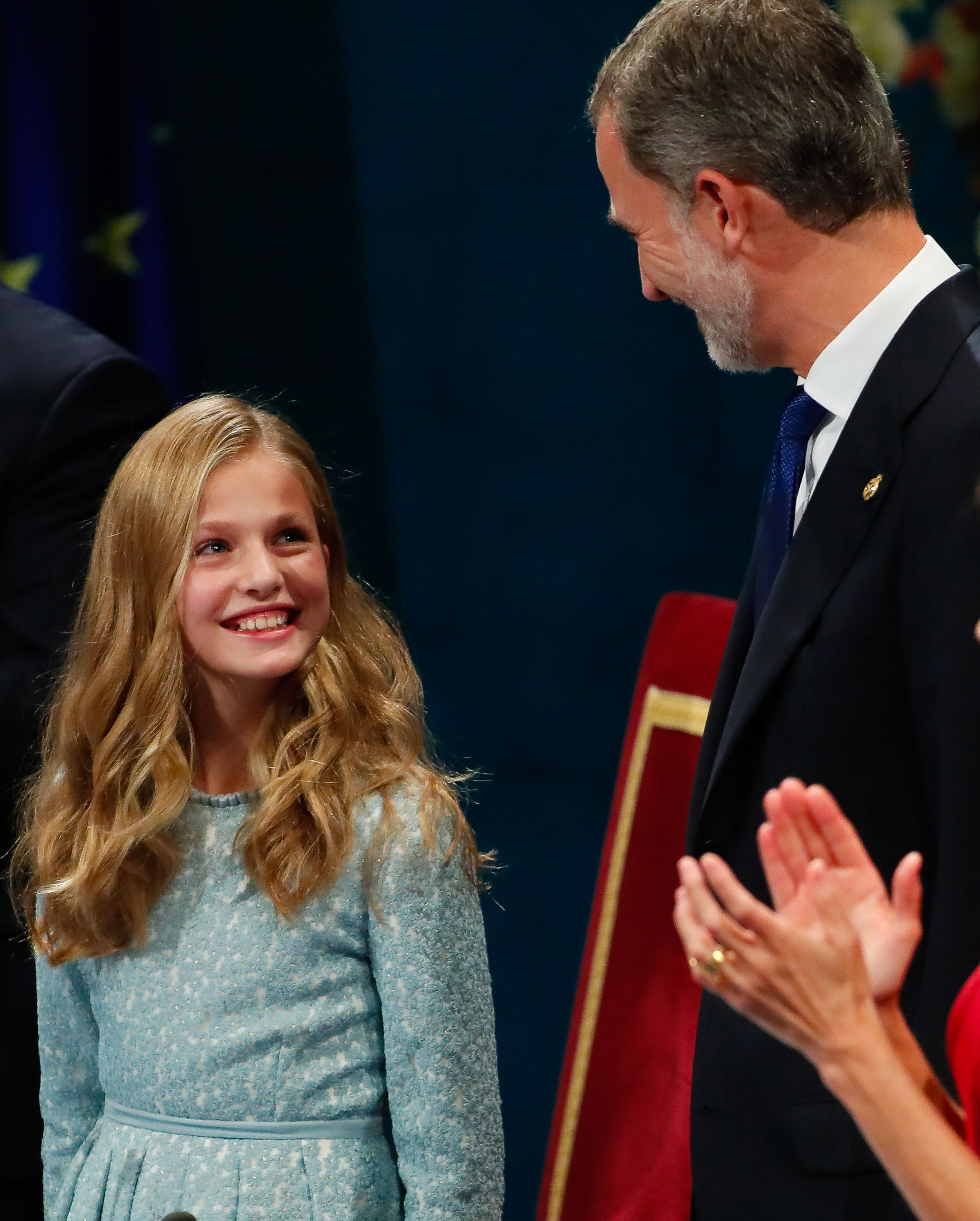Su estilo aquella tarde era el de una niña a punto de entrar en la adolescencia. Leonor lució un romántico vestido azul con vuelo, un claro guiño a Asturias, y bailarinas doradas. El pelo, muy voluminoso con ondas.