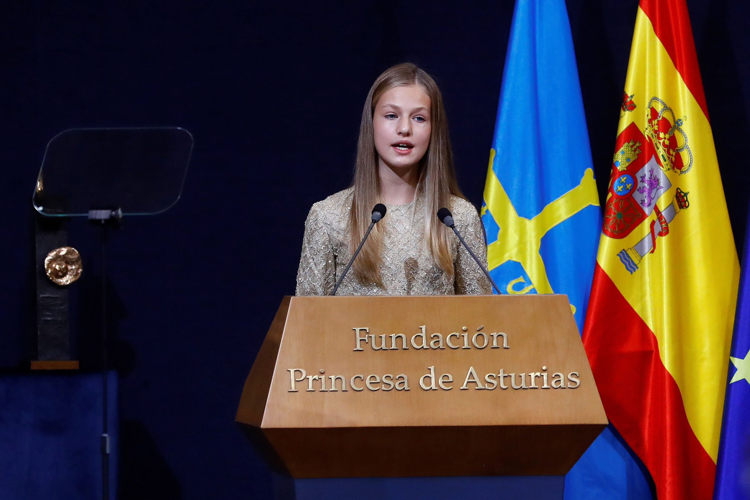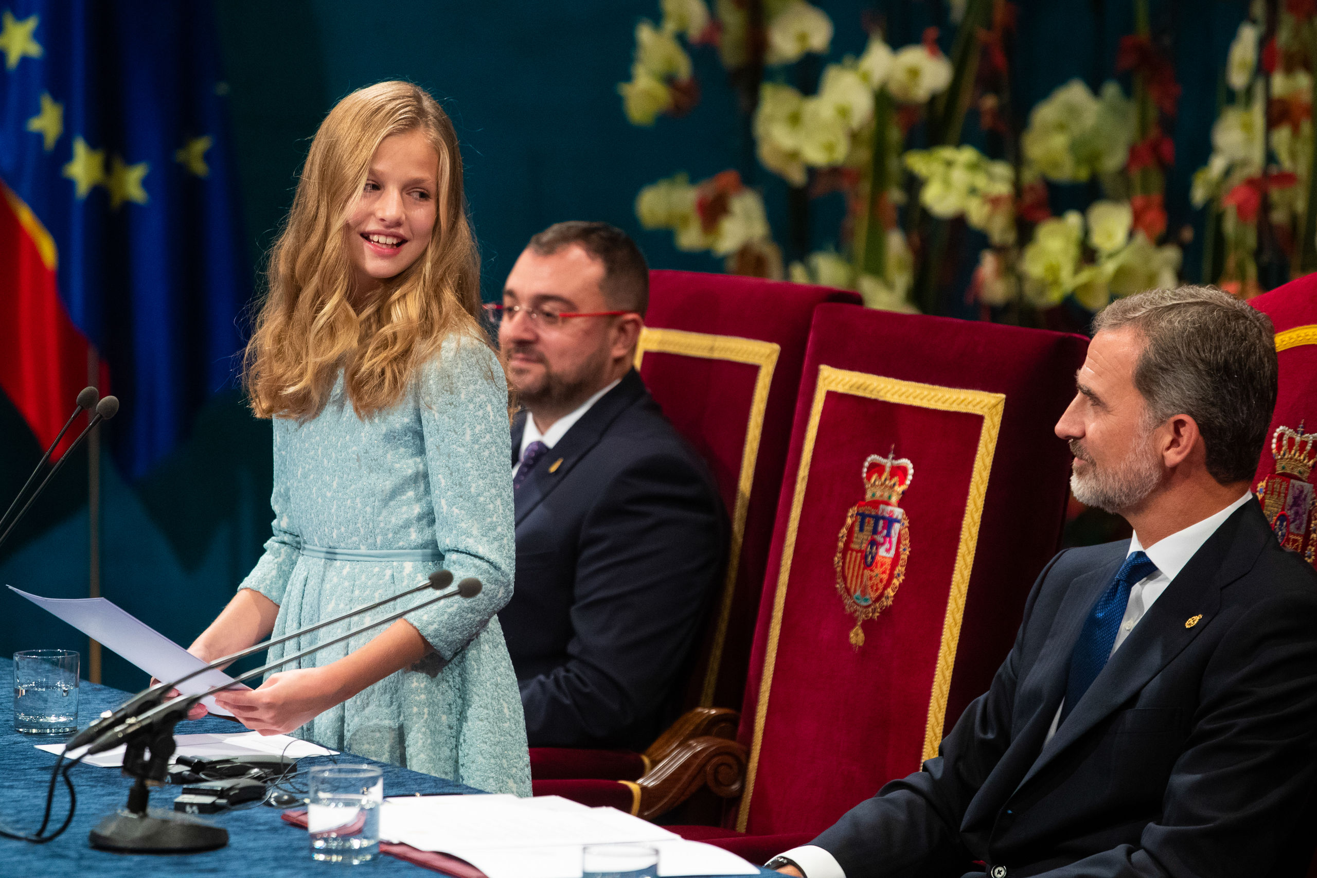 "Mis padres siempre nos han hablado de Asturias, de su cultura, de sus historias, tradiciones y naturaleza, pero sobre todo a admirar y querer a los asturianos(...) Llevo sangre asturiana", dijo. Algo nerviosa pero muy sonriente, Leonor pronunció sus primeras palabras ante unos orgullos padres. Doña Letizia, a punto de llorar en algún que otro momento, se mostró muy emocionada. Nada más terminar, la princesa de Asturias buscó cómplice y con insistencia la aprobación de Felipe VI, que tuvo que recordarle que mirara al público mientras la aplaudían.