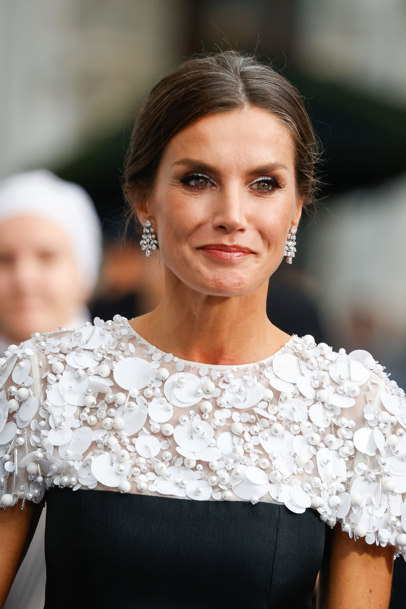 Detalle del cuerpo de manga corta que encabeza el vestido, donde destacan numerosos abalorios que forman motivos florales. La Reina también le dio un toque de color blanco a su maquillaje, destacando los ojos con eyeliner brillante de este color.