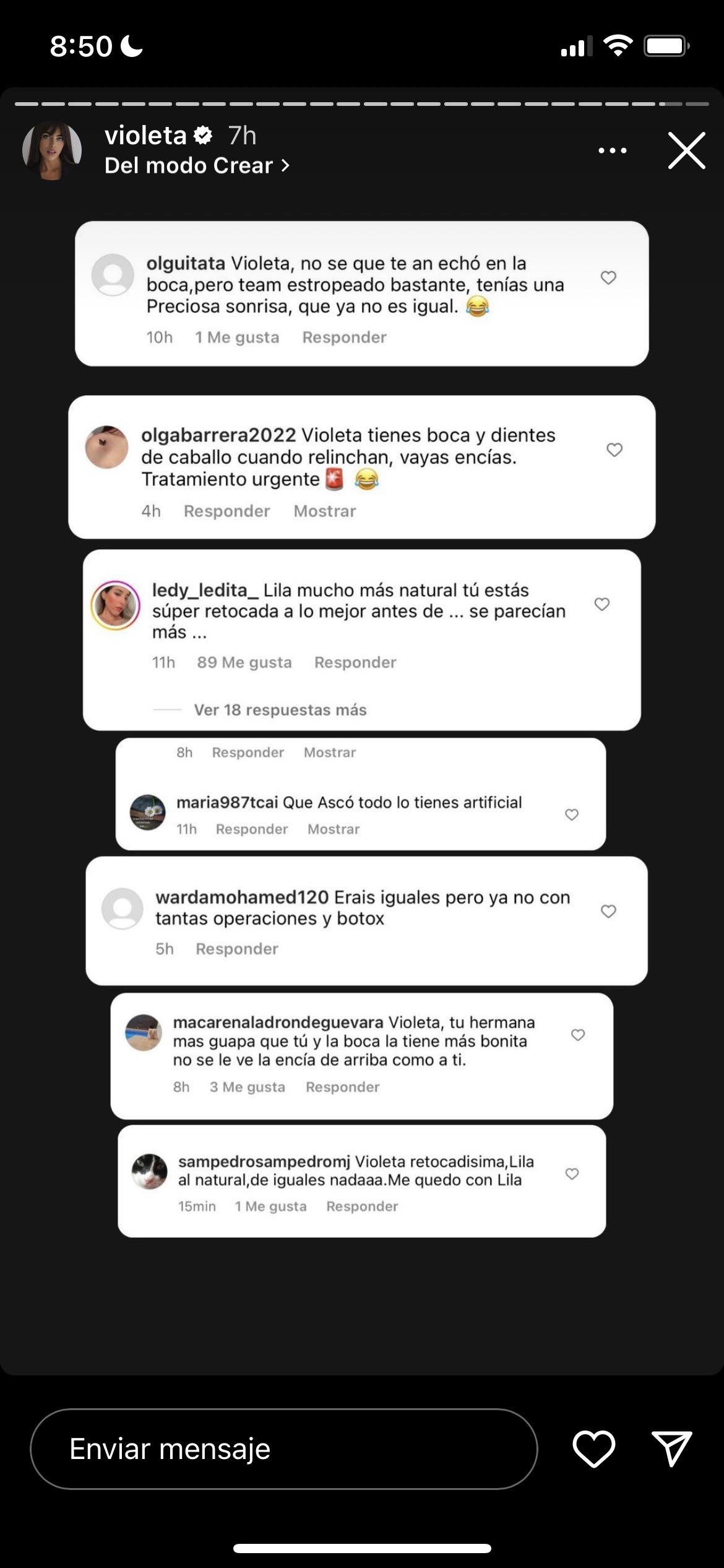 ¿Qué le ocurre a cierto perfil de mujeres que necesitan desahogarse atacando a una modelo o influencer en las redes? Me pregunto qué tipo de motivación sienten para acudir al perfil de Violeta Mangriñán, por ejemplo, que acumula más de 2 millones de seguidores, para escribirle por privado diferentes tipos de insultos y vejaciones. "No sé que te han hecho en la boca, pero te han estropeado bastante", escribe con faltas de ortografía (que las he corregido en mi escrito) una tal @olguitata ; "qué asco, todo lo tienes artificial" celebra otra usuaria de la red, bajo el nombre de @maria987tcai . Como estos, decenas. La valenciana ha tenido la valentía de compartir los pantallazos de todos esos mensajes, en los que la comparan con su hermana al subir una foto de ambas. Y yo tengo los bemoles de replicar el contenido en mi columna (pues sé que muchos de ustedes no usan Instagram y menos aun van a seguir el contenido de Violeta).