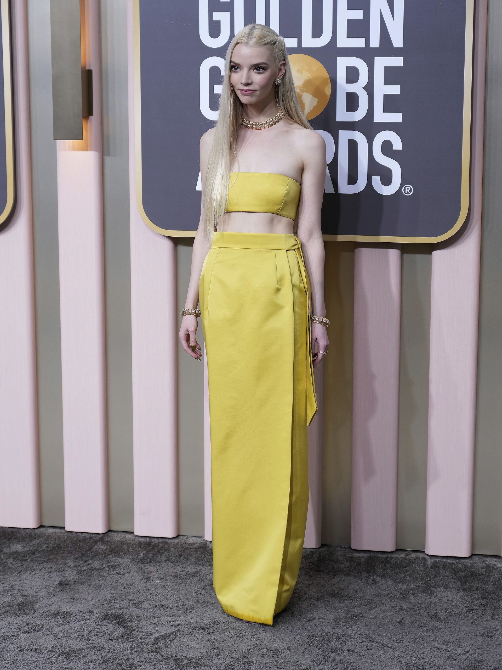 Anya Taylor-Joy eligió un vestido amarillo de Dior. Estaba nominada a Mejor actriz de una película cómica o musical por su papel en 'El menú'.