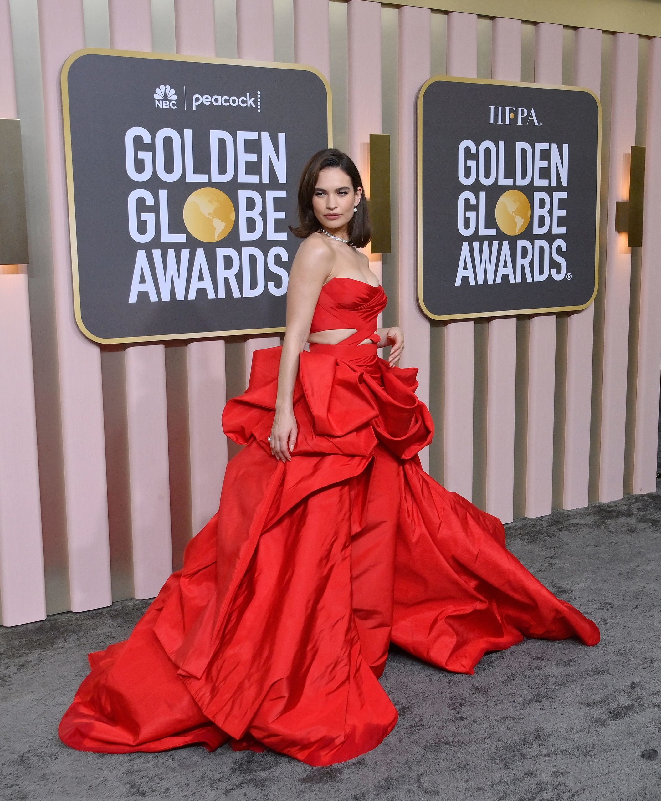 Lily James, nominada a Mejor actriz en una serie limitada o antología dramática por su papel en 'Pam & Tommy', con vestido rojo de Atelier Versace.