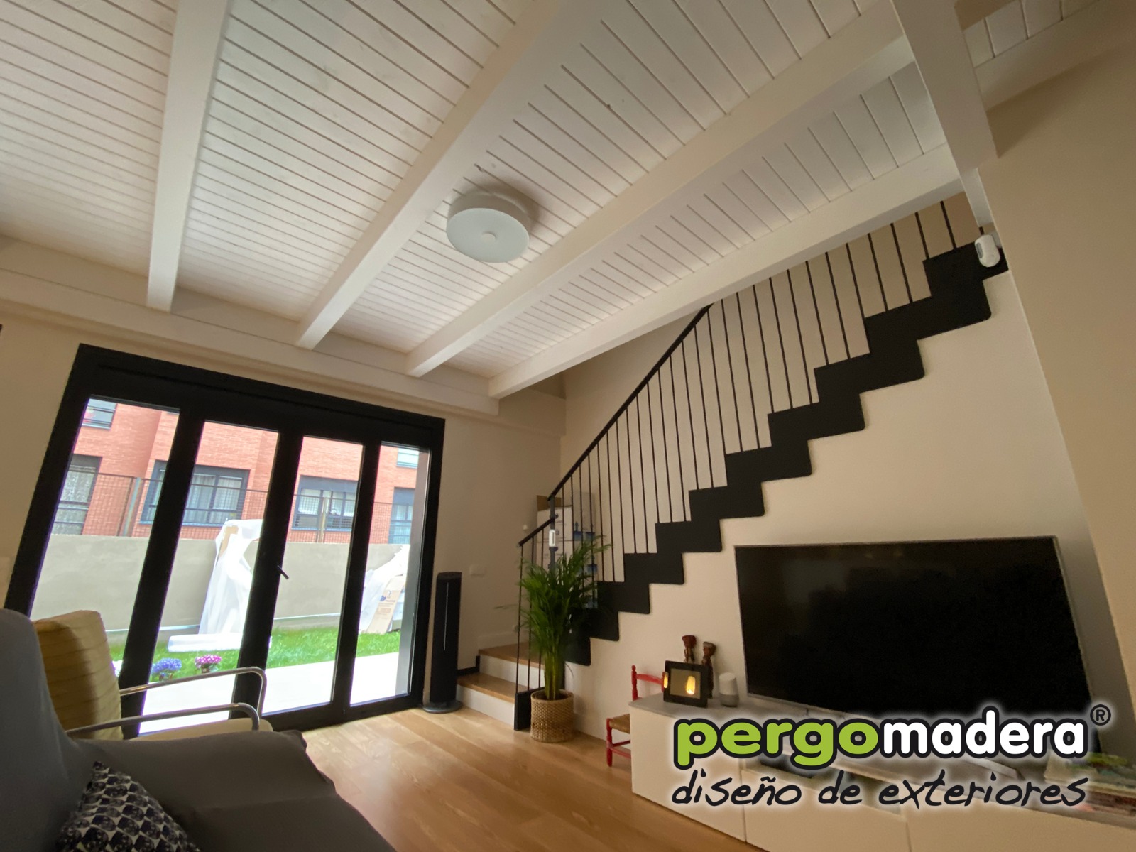 Si lo que te preocupa es que la remodelación o cerramiento del porche le reste valor a la casa o le quite luz, no te preocupes, porque con el debido asesoramiento eso no ocurrirá, como vemos en este cerramiento de porche de madera en el que se han pintado las vigas de color blanco para ganar luminosidad, y se ha utilizado la madera de pino, que también es un material muy fresco.