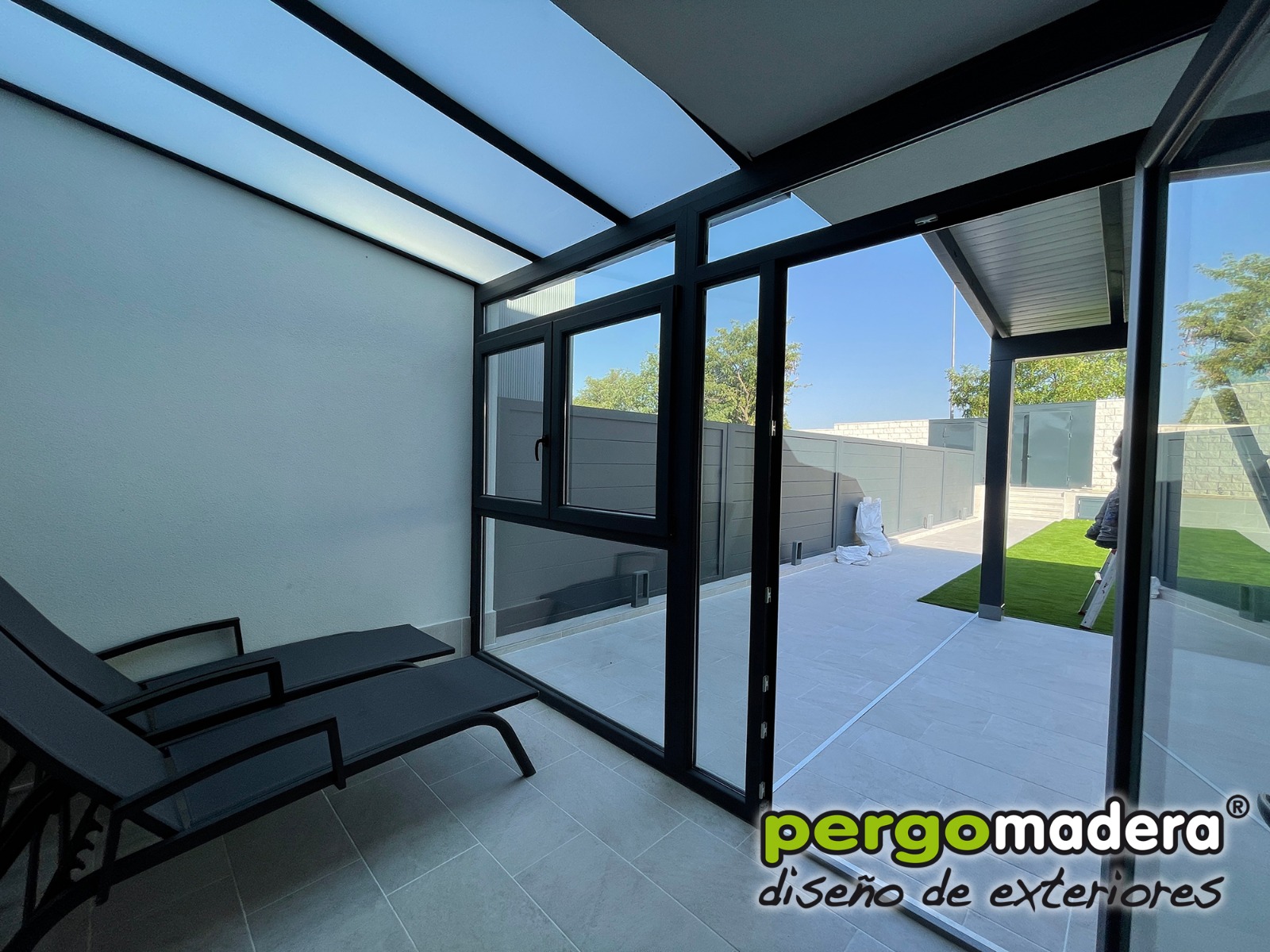 El cerramiento con una pérgola acristalada siempre es una buena inversión para aquellos que deseen una buena panorámica del exterior y quieran sentirse fuera todo el tiempo sin tener que renunciar a hacerlo en los meses más adversos climatológicamente hablando. Por eso, este tipo de cerramiento es ideal para aquellas casas que dispongan de un hermoso jardín en el que poder tomar el sol también en invierno disfrutando de las vistas. Y esto es precisamente lo que podemos ver en este proyecto de cerramiento de pérgola acristalada con techo motorizado; hace de solárium cerrado durante el invierno, pudiendo volver a abrirse de nuevo en los meses de más calor.