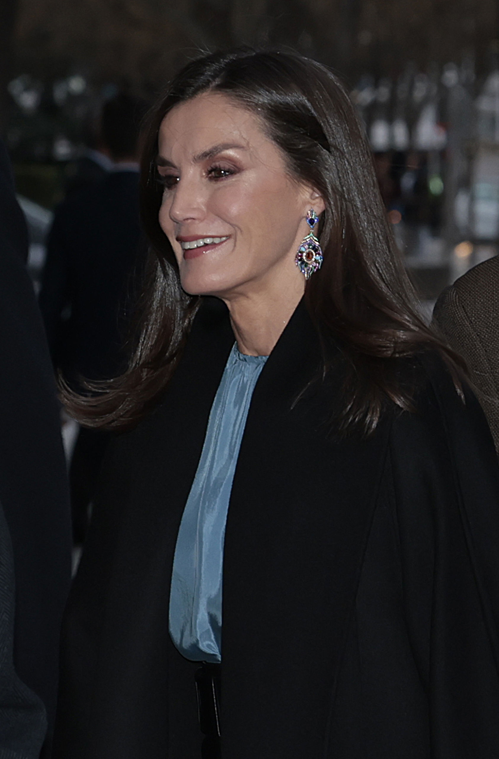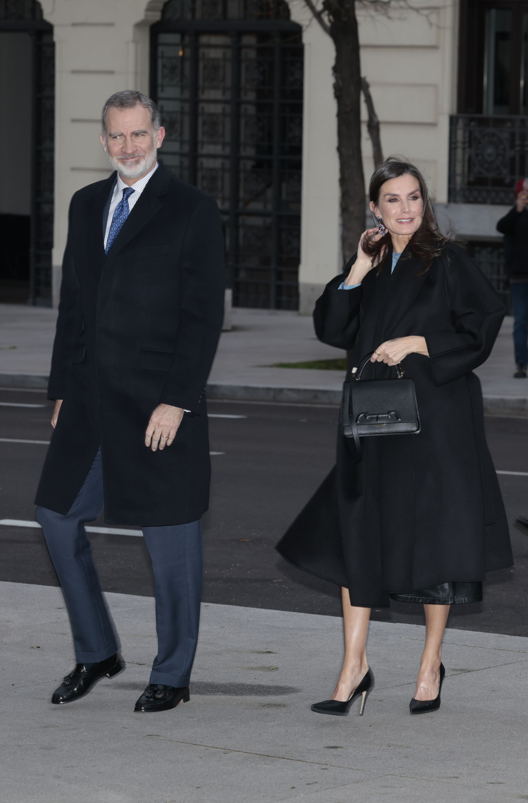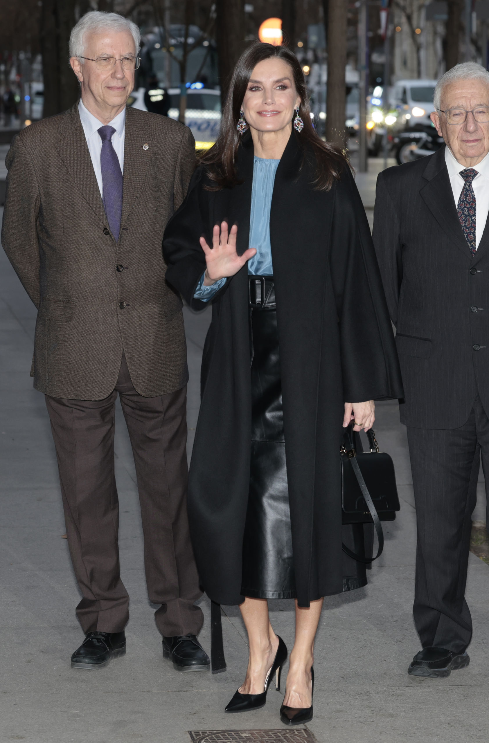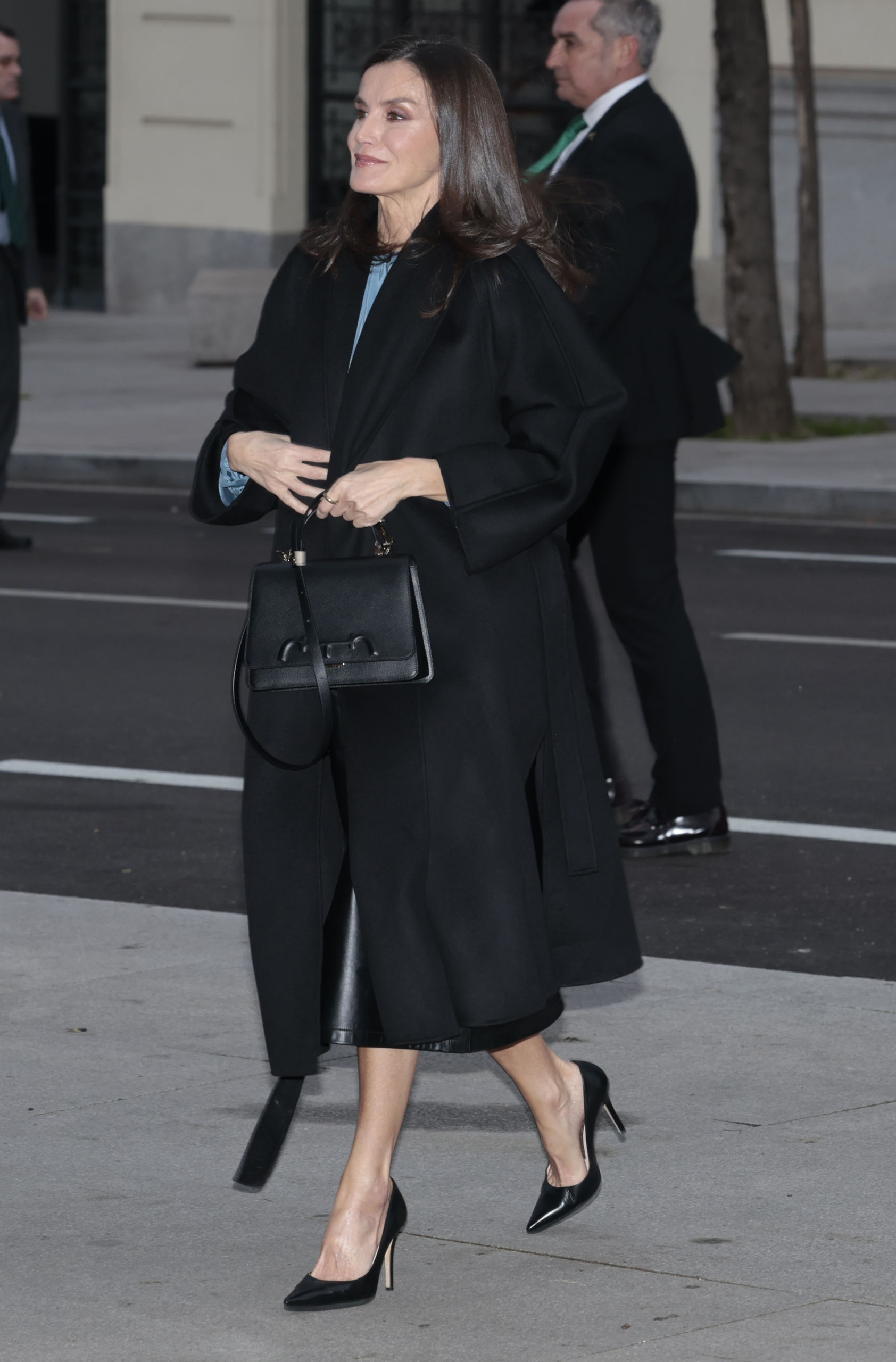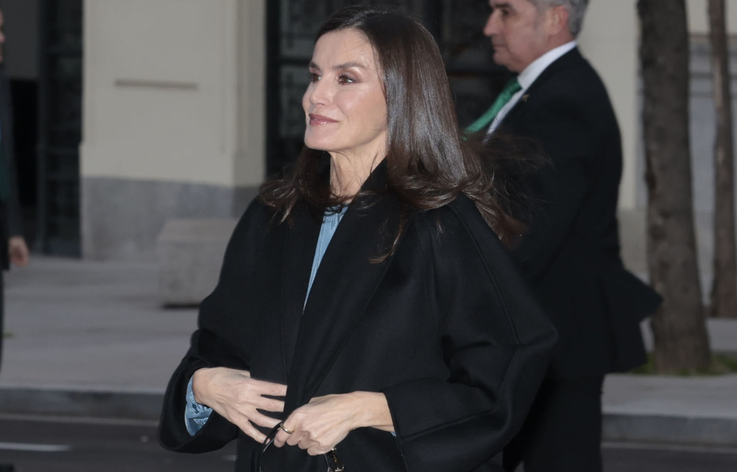 Esta tarde, la Reina repitió la misma fórmula que utilizó en enero de 2020 para acudir a una reunión de trabajo con miembros del consejo nacional de la AECC (Asociación Española Contra el Cáncer): abrigo negro, blusa azul, falda negra y salones negros. Aunque en aquella ocasión se abrigó con una capa, el frío de Madrid le hizo escoger una prenda más gruesa, como es este diseño abierto de solapas sin cierre de botones, de Mango.