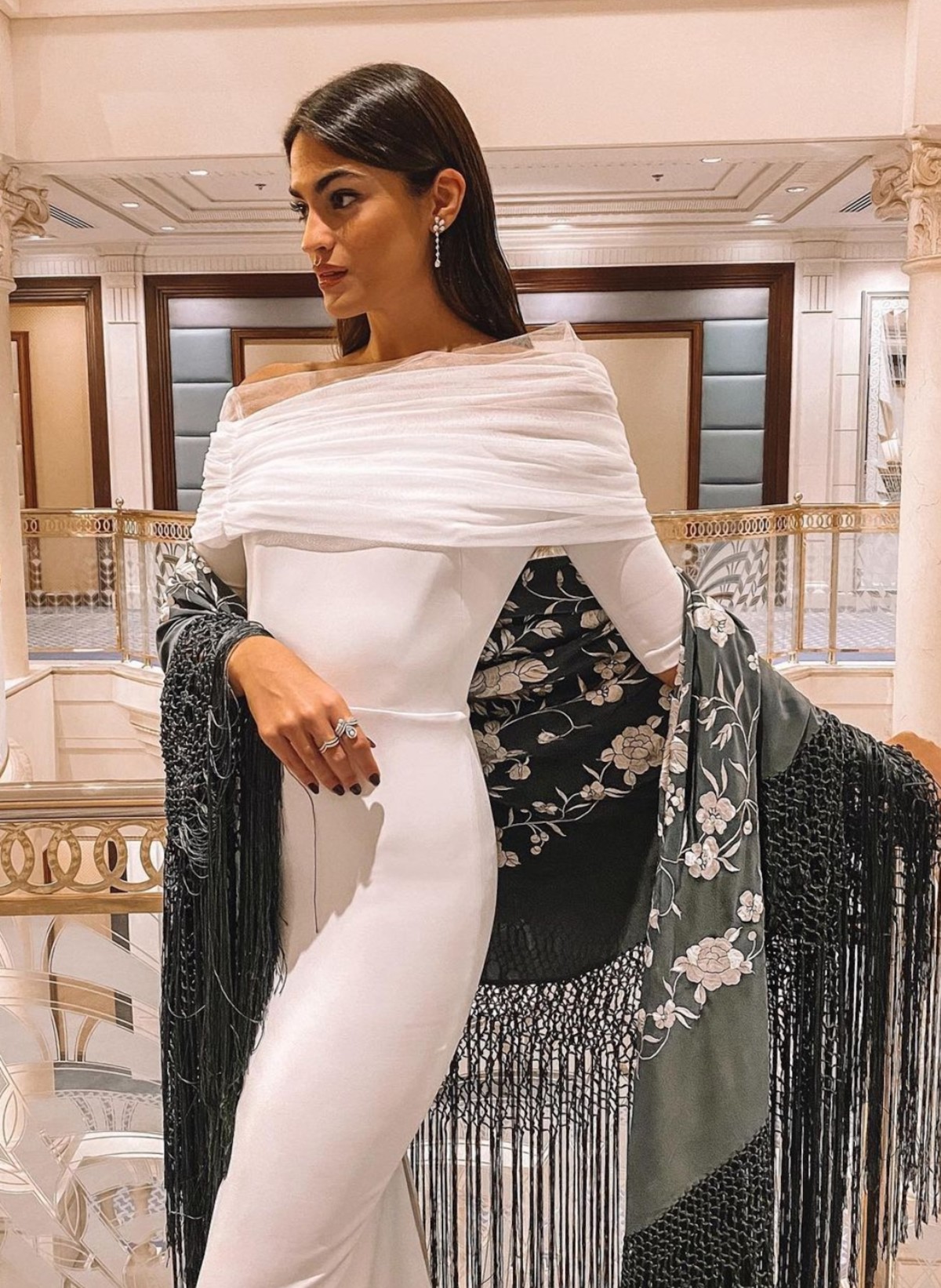La madre de la futura novia ha confiado también en la firma que vestirá a su hija. Un ejemplo, este vestido blanco de escote bardot que llevó en 2016 en un evento de Rolex y Rabat.