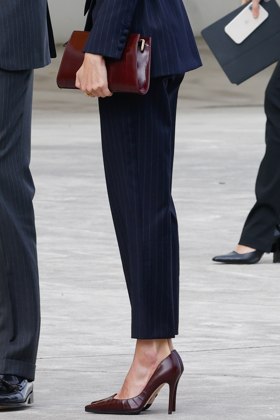 En esta ocasión optó por accesorios color vino: salones nuevos de Magrit elaborados en piel con relieve y clutch de la misma firma.