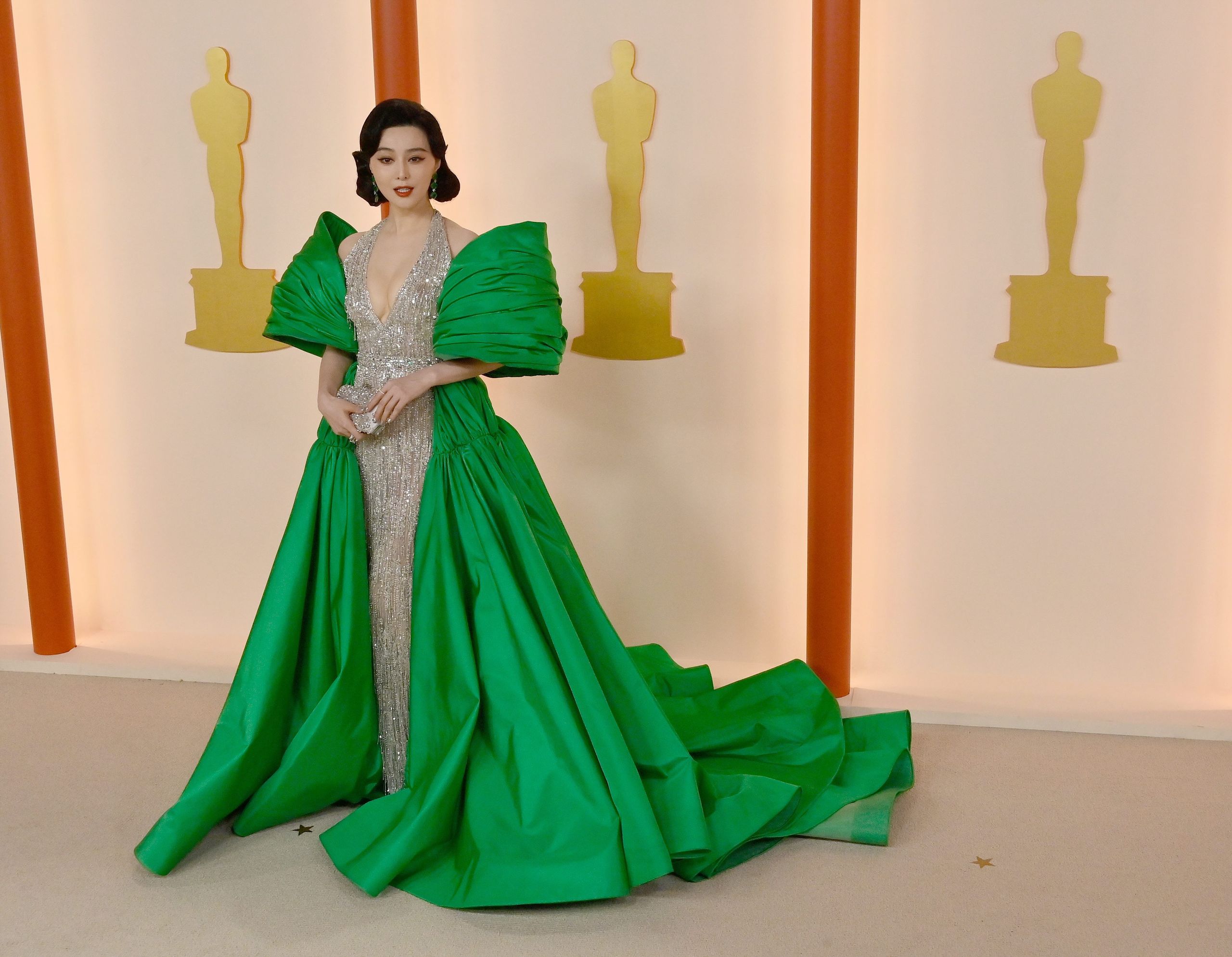 La actriz china con un espectacular vestido plateado bordado a mano con sobrefalda y mangas de tafetán verde firmado por Tony Ward Couture.