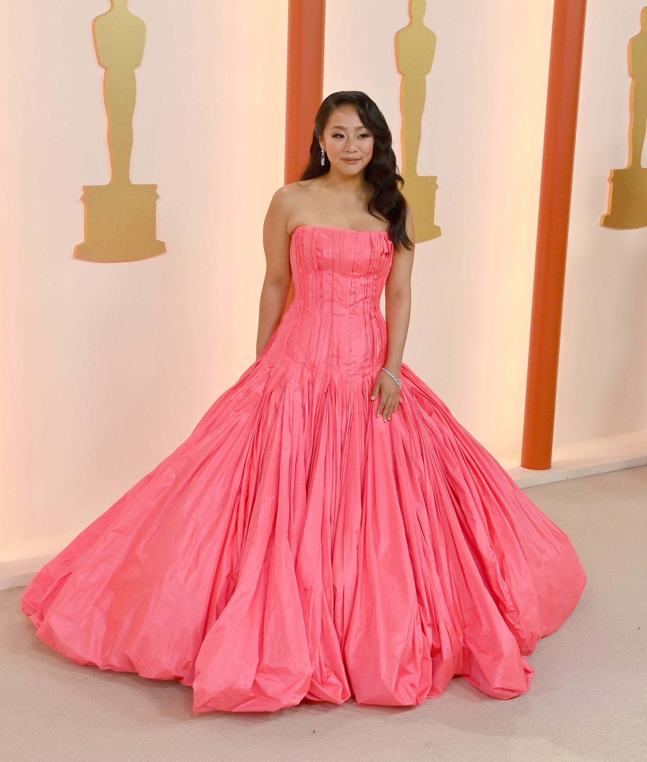 Con vestido rosa de Valentino, la actriz acudió a la alfombra roja de los Oscars como nominada a Mejor actriz de reparto por Todo a la vez en todas partes.