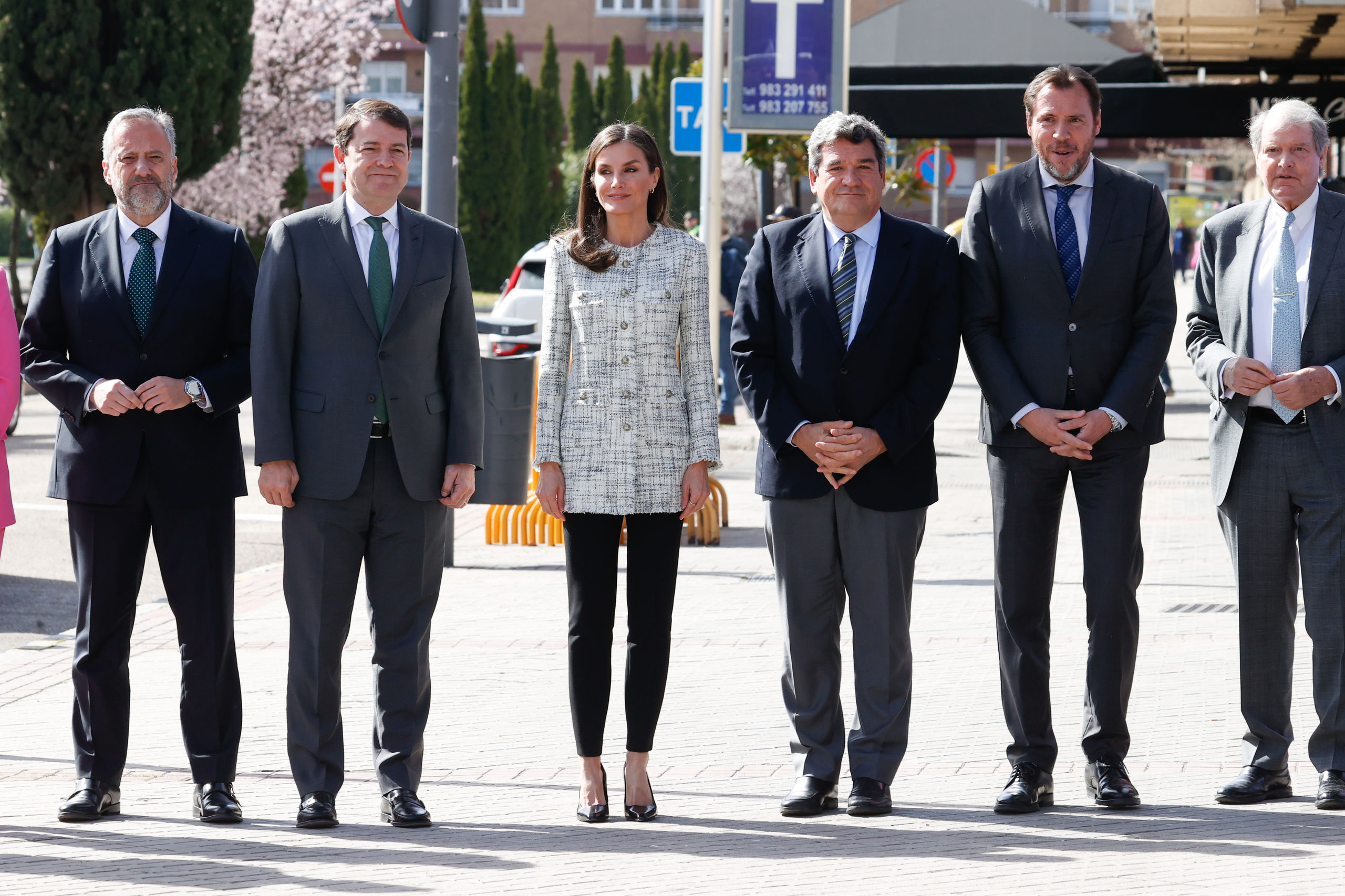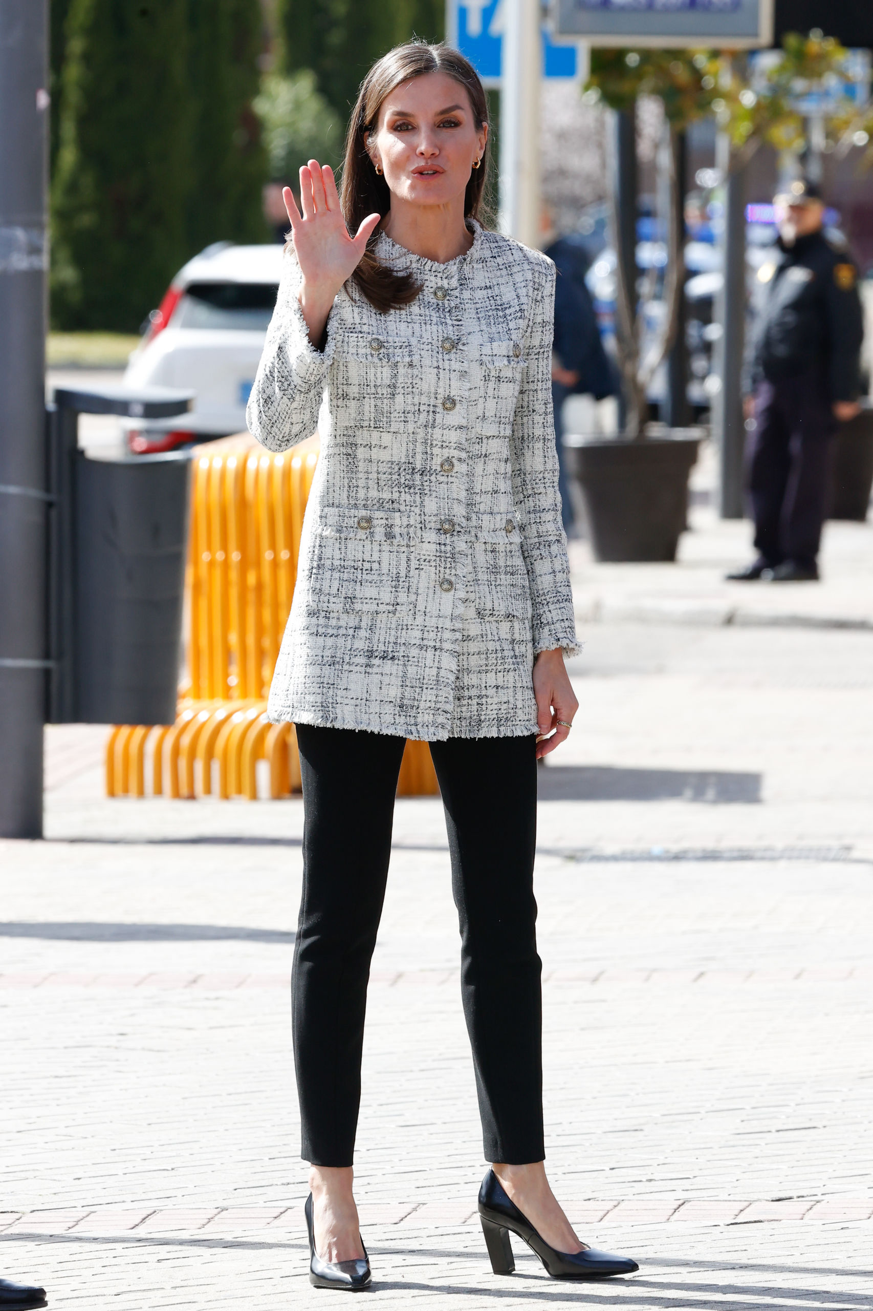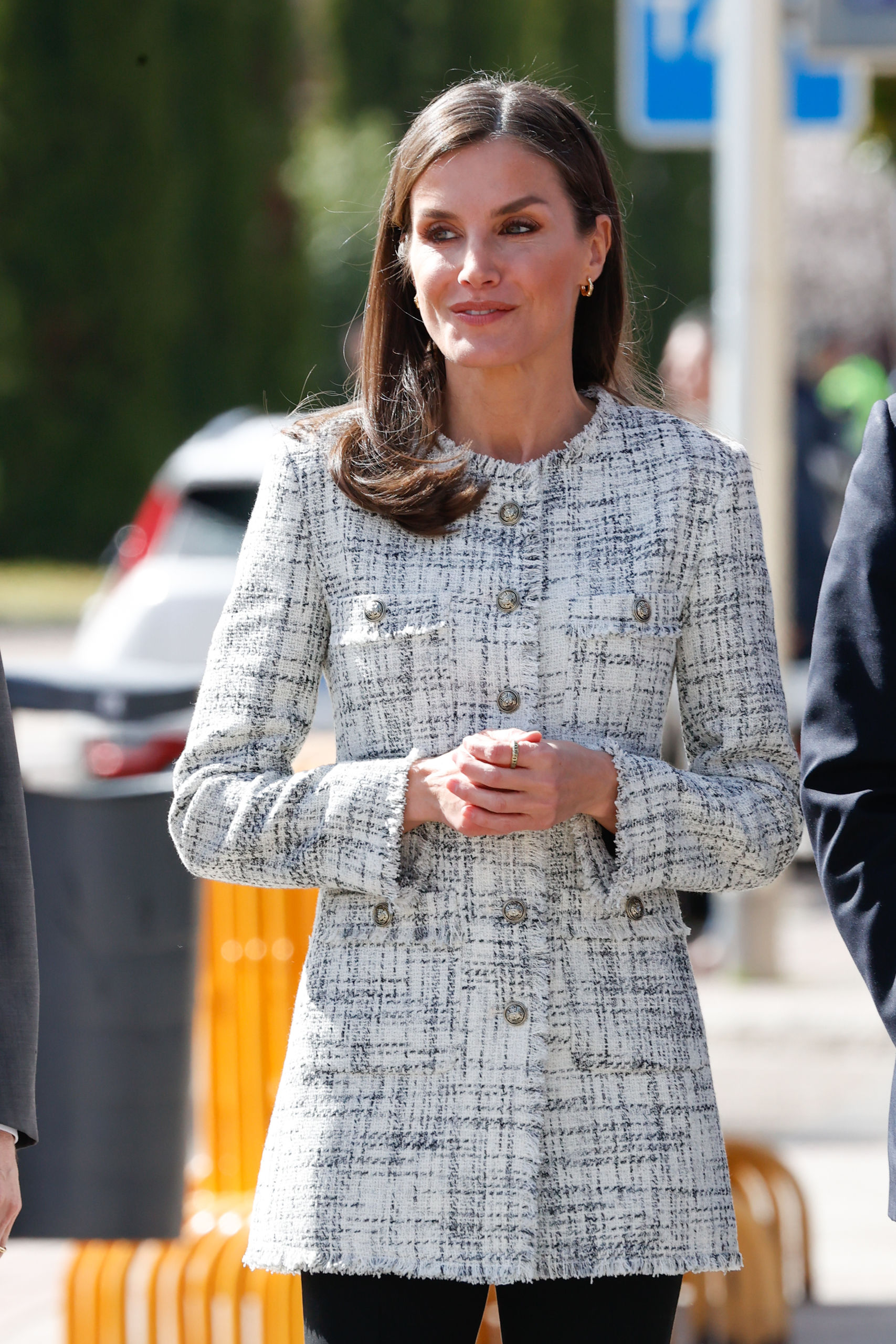 Para esta visita, la Reina estrenó una primaveral chaqueta larga de Massimo Dutti con botones dorados de esta temporada y que se encuentra a la venta en su página web por 149 euros. La chaqueta tiene cuello redondo, cierre de botones, cuatro bolsillos de parche y forro interior y es perfecta para las temperaturas suaves que están por venir y los looks de diario.