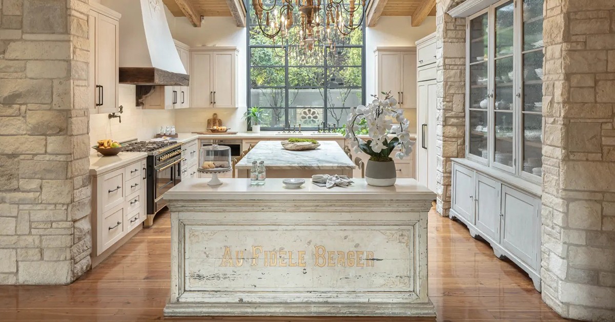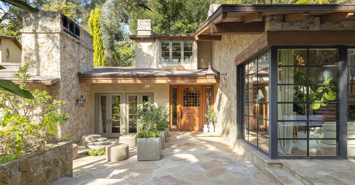 La casa cuenta con una sala de estar con chimenea, techos altos, un bar y ventanas y puertas de acero que se abren a las terrazas de piedra.
