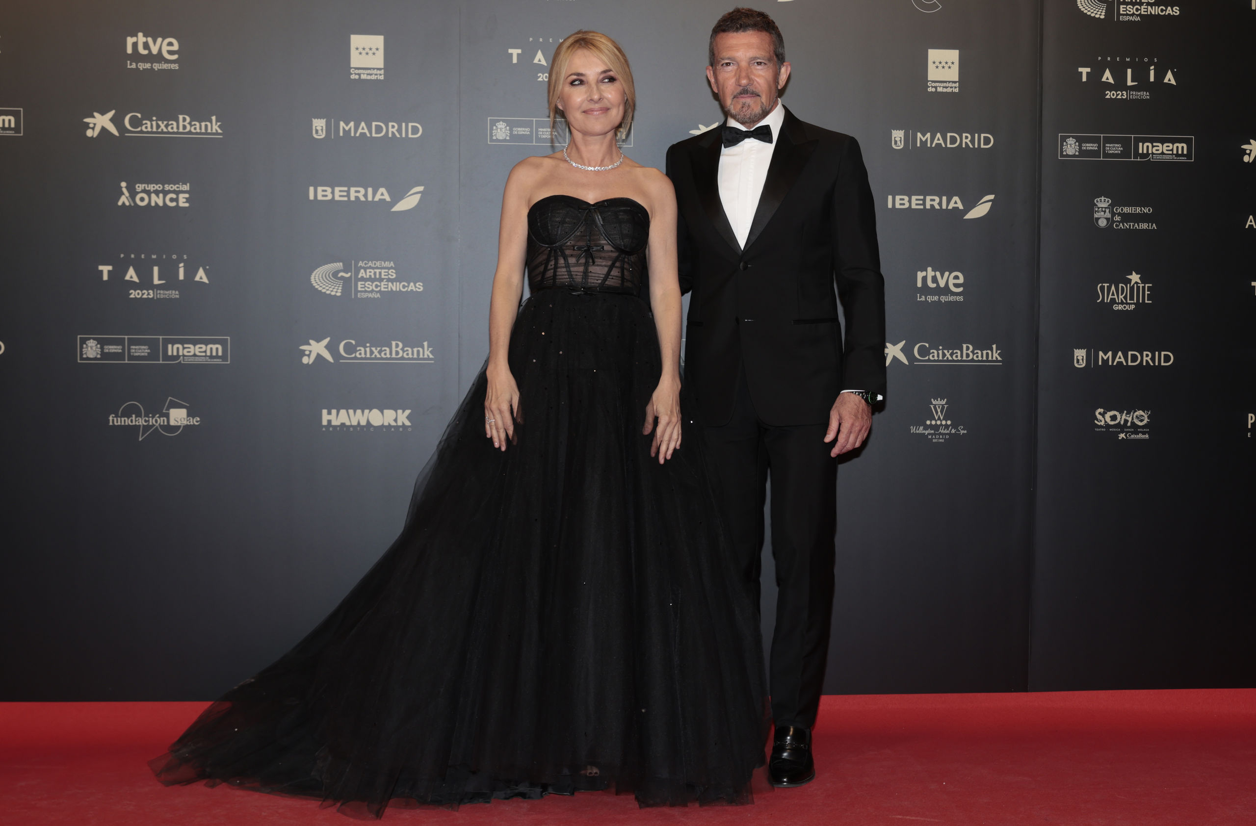 La actriz, muy elegante con vestido negro con escote palabra de honor y top tipo corsé y falda larga de tul. Banderas fue premiado como ‘Mejor actor de Teatro Musical’ por Company.