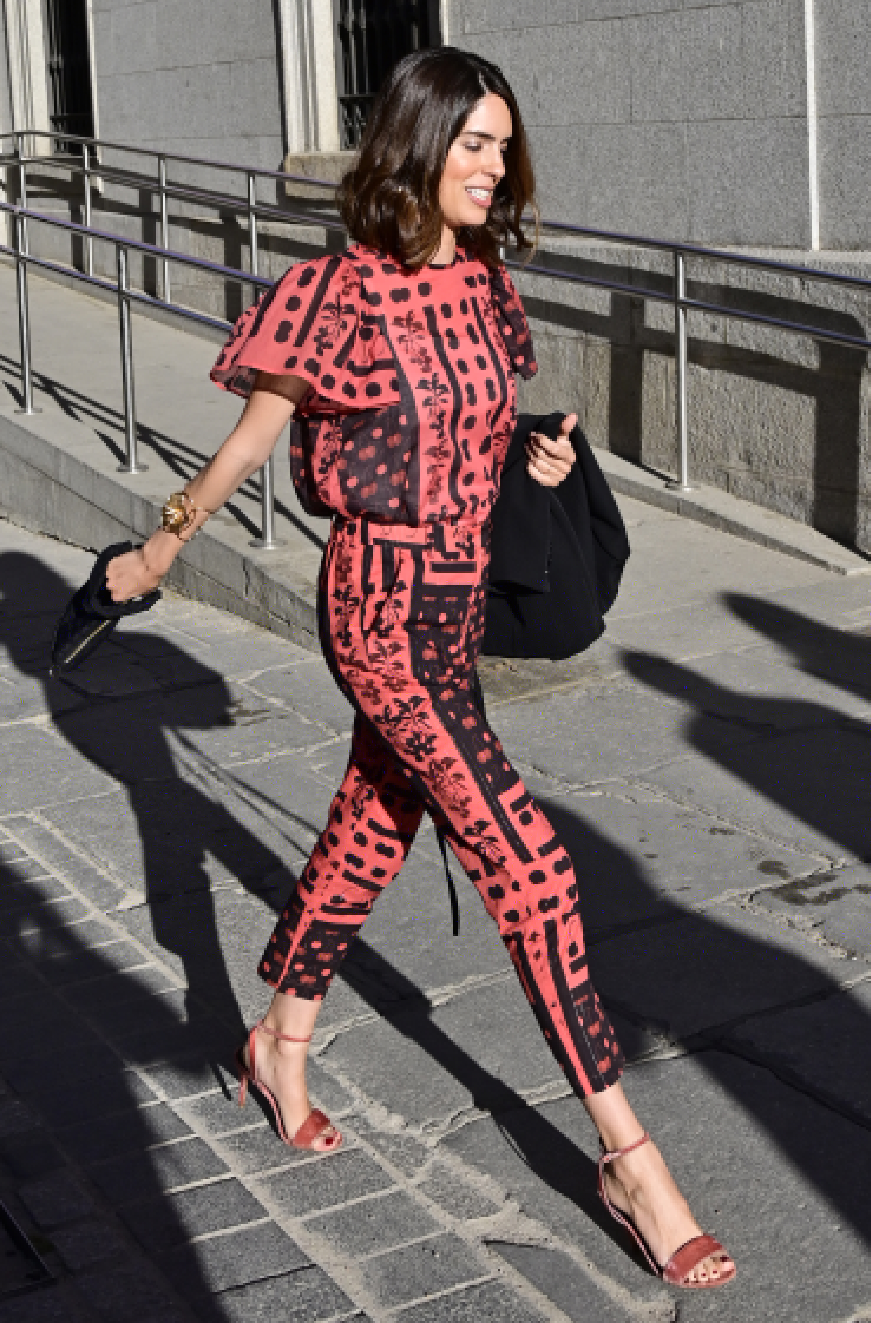 El conjunto es tan colorido que los accesorios fueron sencillos: sandalias de tira en terciopelo en tono coral, bolso negro y un brazalete dorado adornado con una gran flor.
