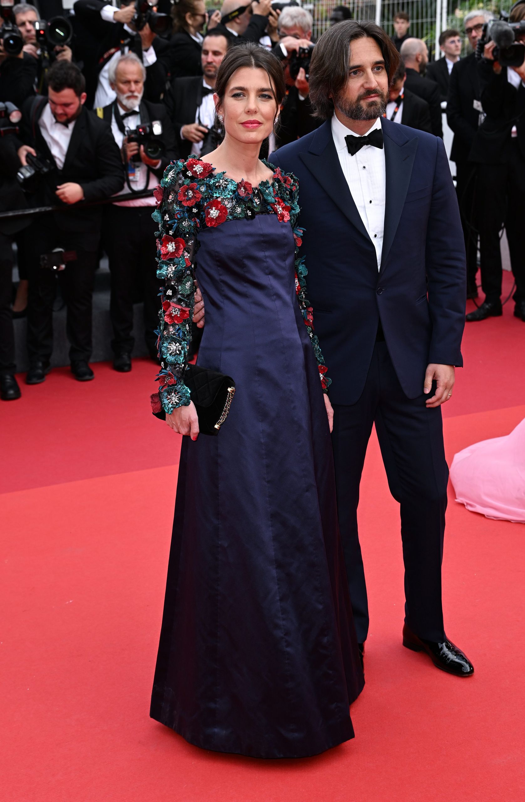 La hija de Carolina de Mónaco acudió con su marido, Dimitri Rassam, luciendo un vestido cortesía de Chanel de tafetán negro y un llamativo escote floral, confeccionado meticulosamente con lentejuelas y cuentas de colores sobre una malla de tul.