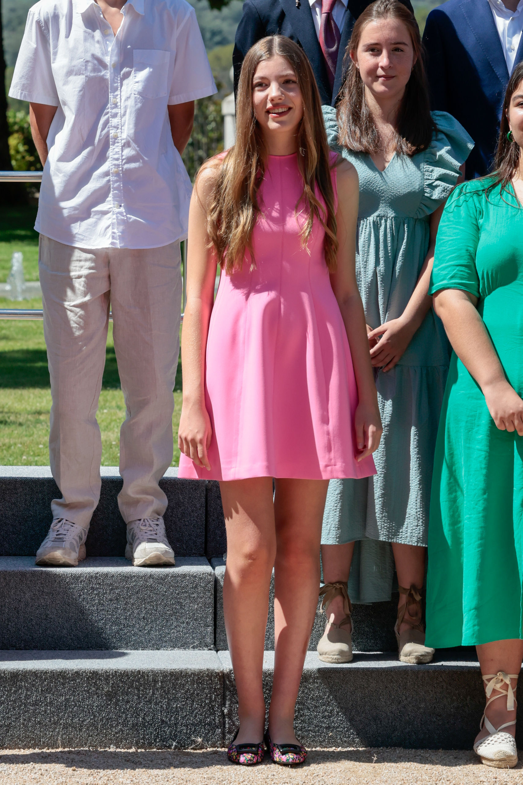 El mini vestido rosa de Sofía lo firma Sfera y las bailarinas con estampado floral son de Adeba. La hija menor de los Reyes pudo conversar con quienes, al igual que ella, se preparan para vivir la experiencia de convivir y asistir a clase en un internado con estudiantes de 80 países.