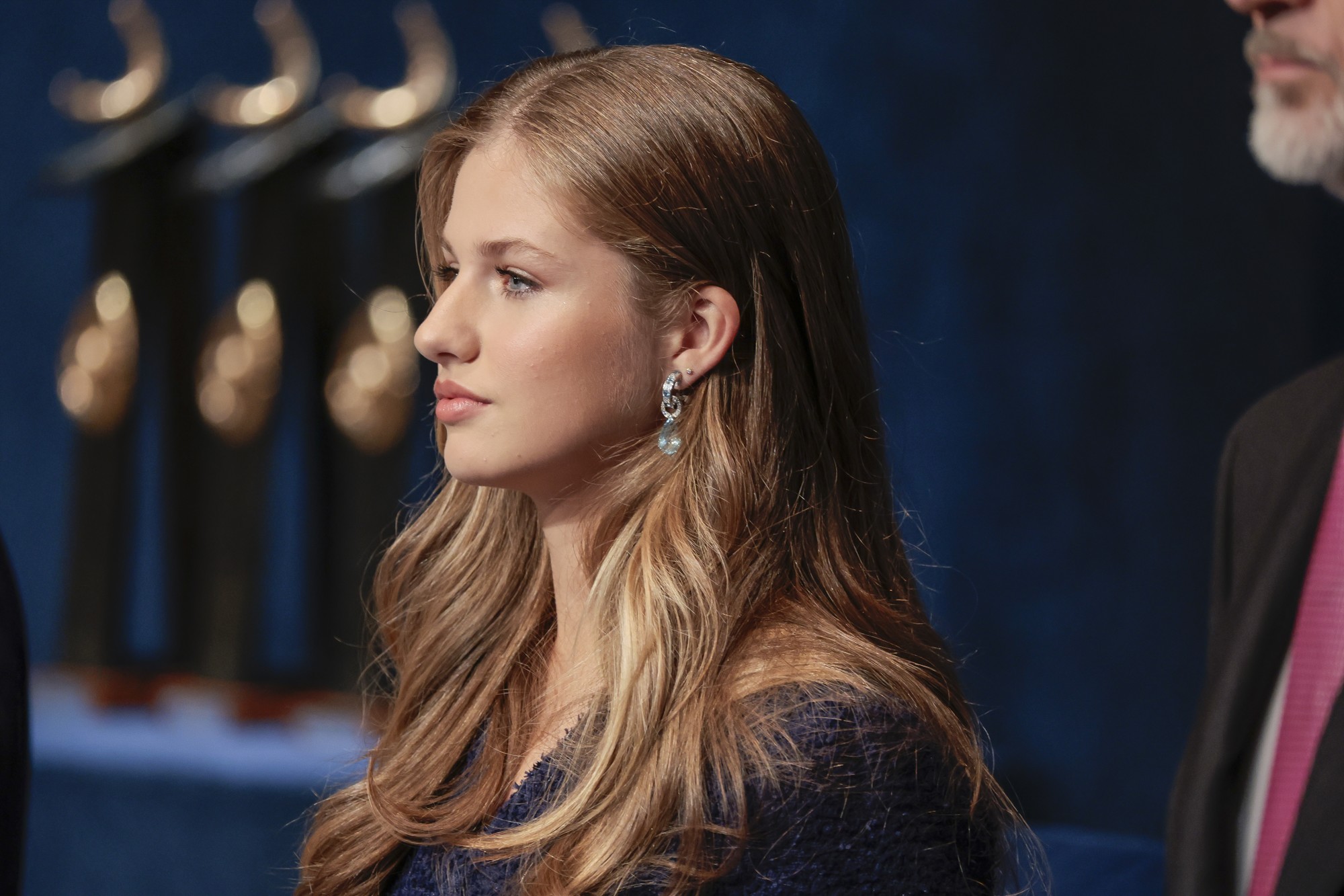 Leonor, guapísima con un maquillaje natural, sorprendió luciendo los pendientes de aguamarina de Aldao que Felipe VI le regaló a doña Letizia con motivo del nacimiento de la heredera hace casi 18 años.