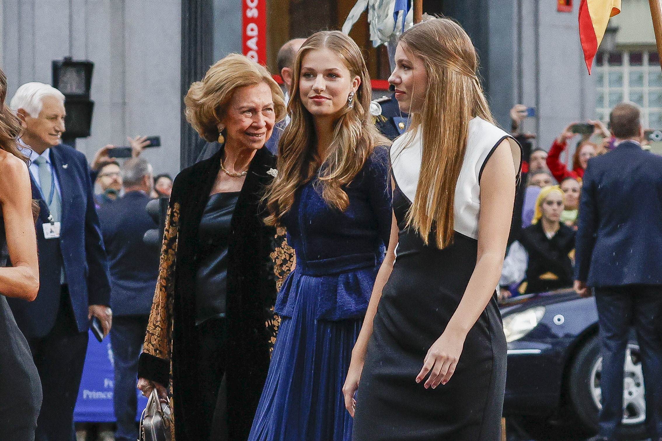 Los Reyes, acompañados por sus hijas y la reina emérita, llegaron puntuales, a las 18.30, al Teatro Campoamor de Oviedo. La comitiva real partió del Hotel Reconquista acompañada del sonido de las gaitas y de una multitud de gente que quería saludar a la Familia Real.