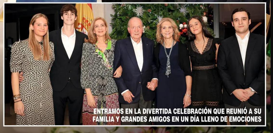 La revista Hola lleva a sus páginas de este miércoles fotografías exclusivas de la fiesta por el 86º cumpleaños del rey Juan Carlos, un evento celebrado el pasado 5 de enero en Abu Dabi que congregó a un centenar de invitados entre miembros de la familia Borbón y Grecia y otros amigos del emérito. En la portada vemos a Juan Carlos I cortando una tarta con cobertura de fondant y su escudo de armas y más abajo, posando orgulloso con sus hijas, las infantas Elena y Cristina, y sus nietos Froilán y Victoria Federica Marichalar y Pablo e Irene Urdangarin.