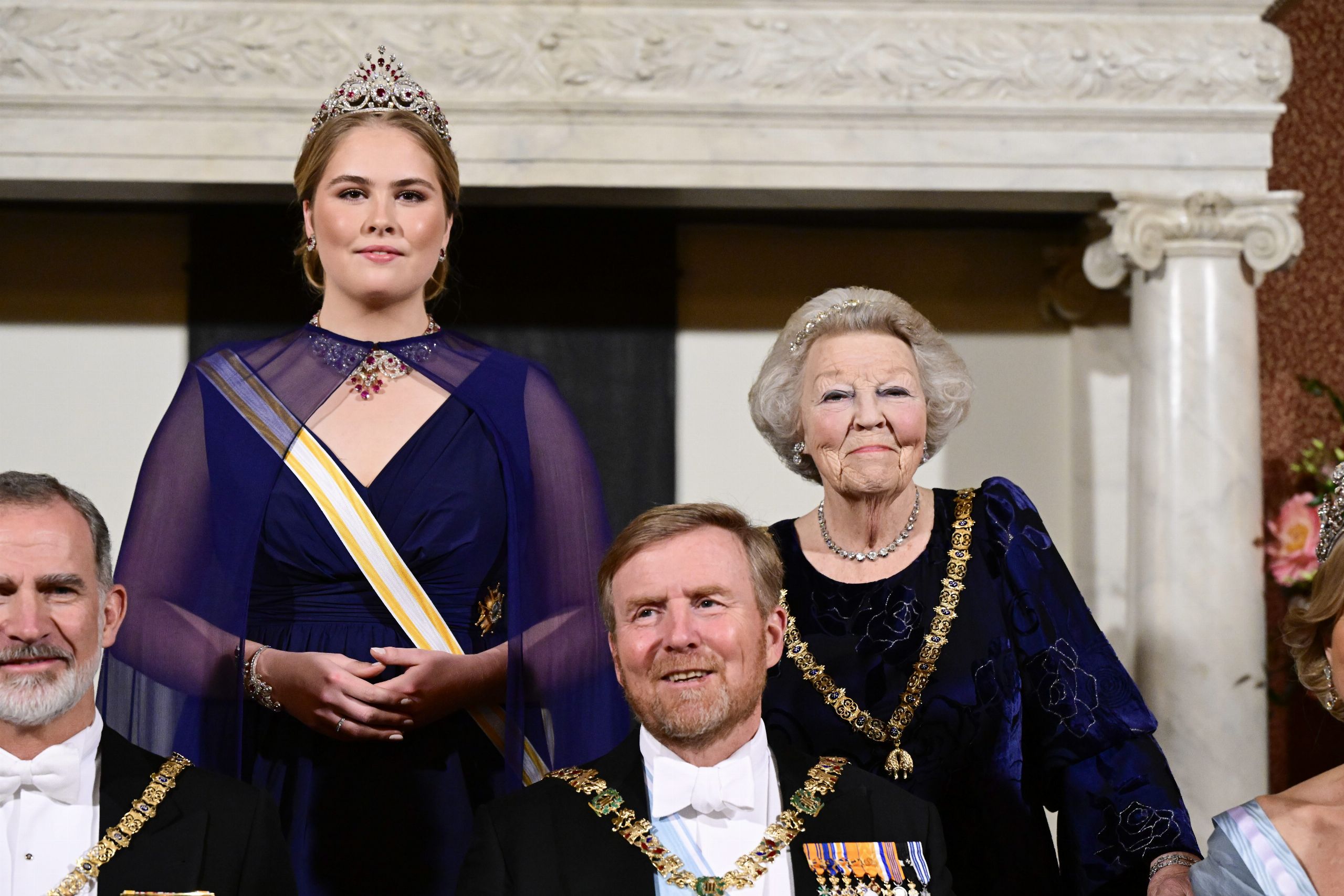 Con motivo de la visita de Estado de los Reyes a los Países Bajos, por la noche tuvo lugar una cena de gala en la que la novedad fue el estreno de la princesa heredera Amalia, de 20 años, y en la que también estuvo la reina Beatriz, quien abdicó en su hijo en 2013 después de 33 años en el trono.