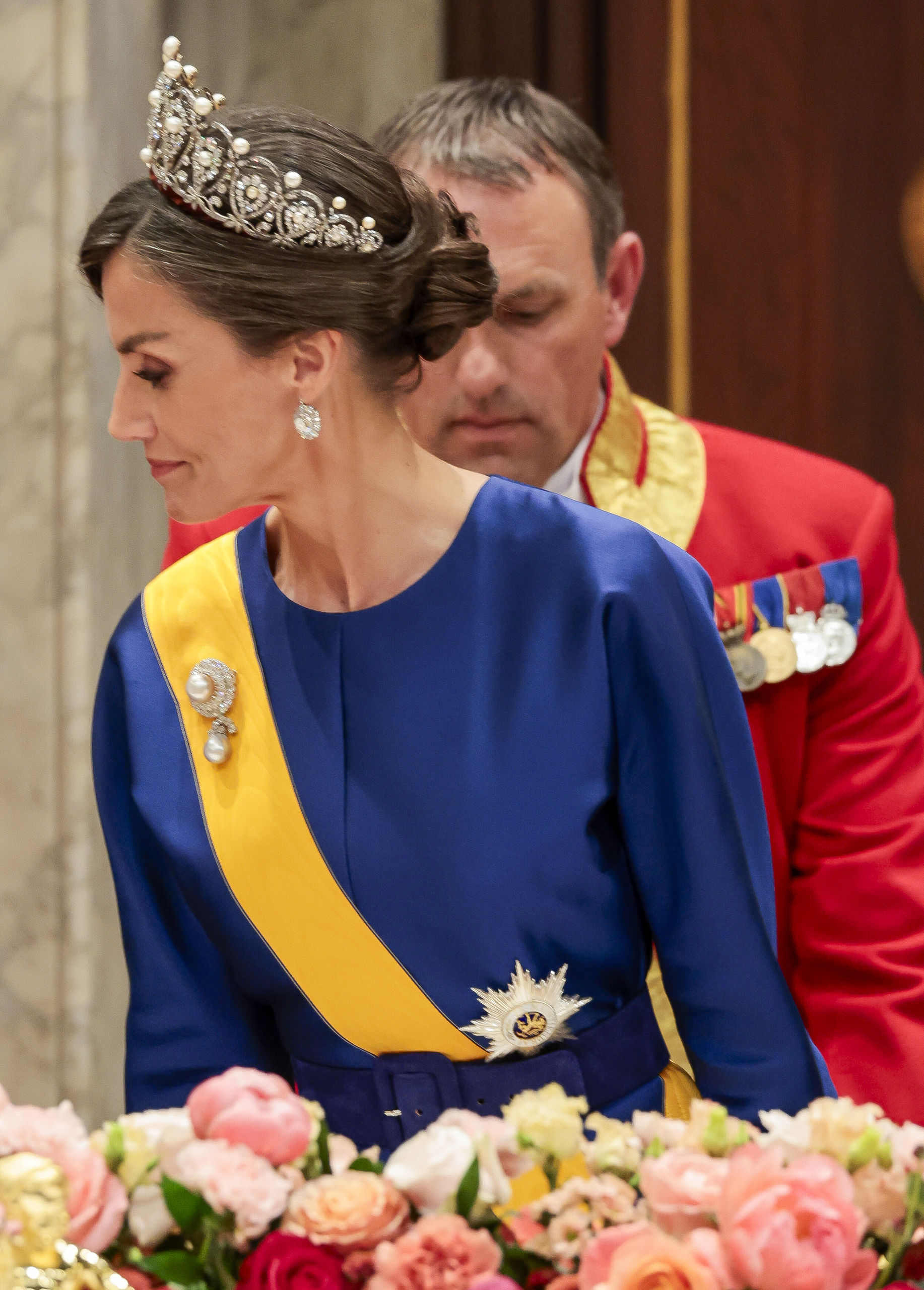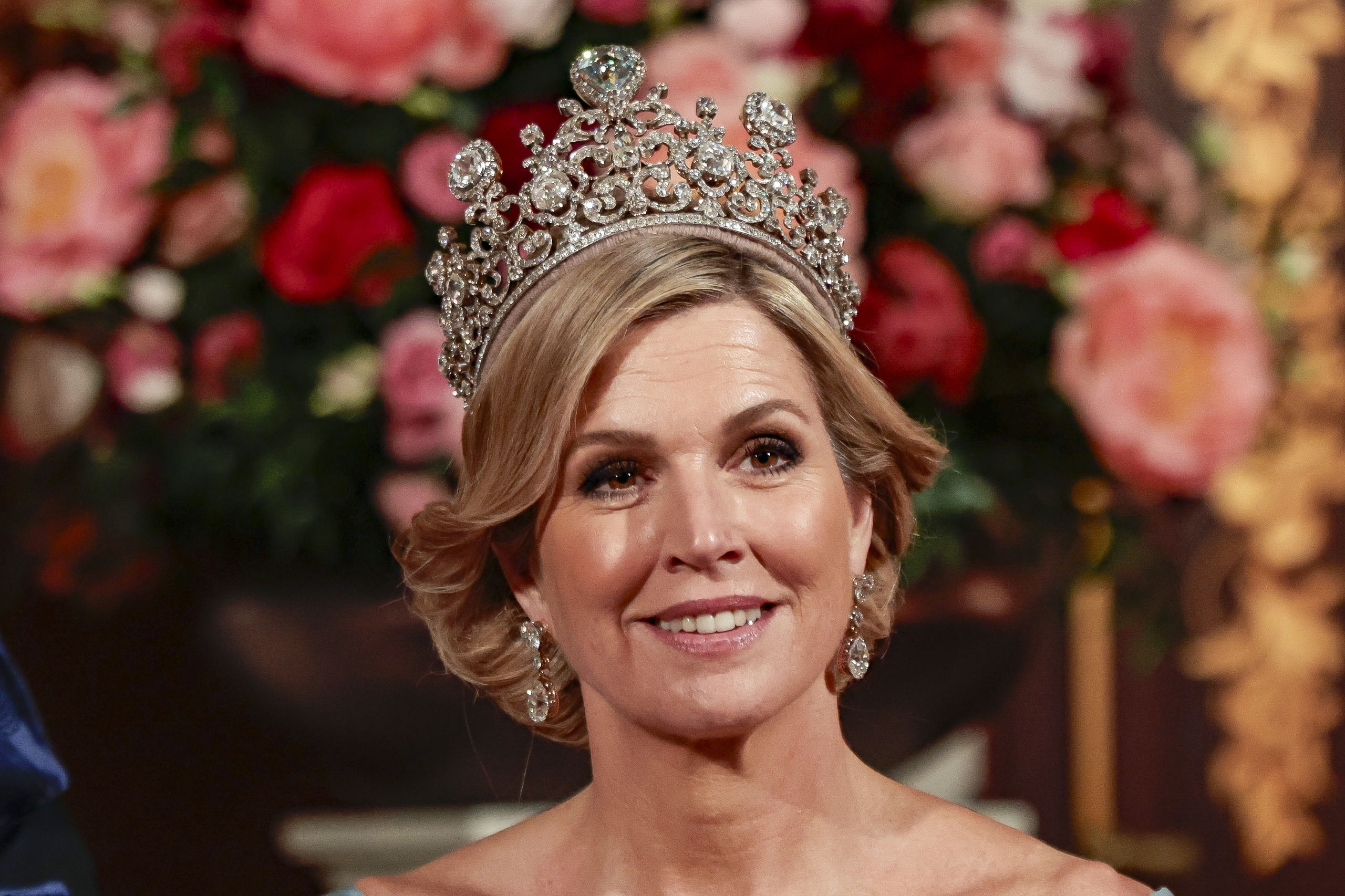Espléndida también estaba la reina Máxima con un vestido vaporoso en gasa azul, con tablillas en la cintura y hombros descubiertos. Un gran broche de la colección de los Estuardo, a la que también pertenece la tiara, remataba el estilismo.