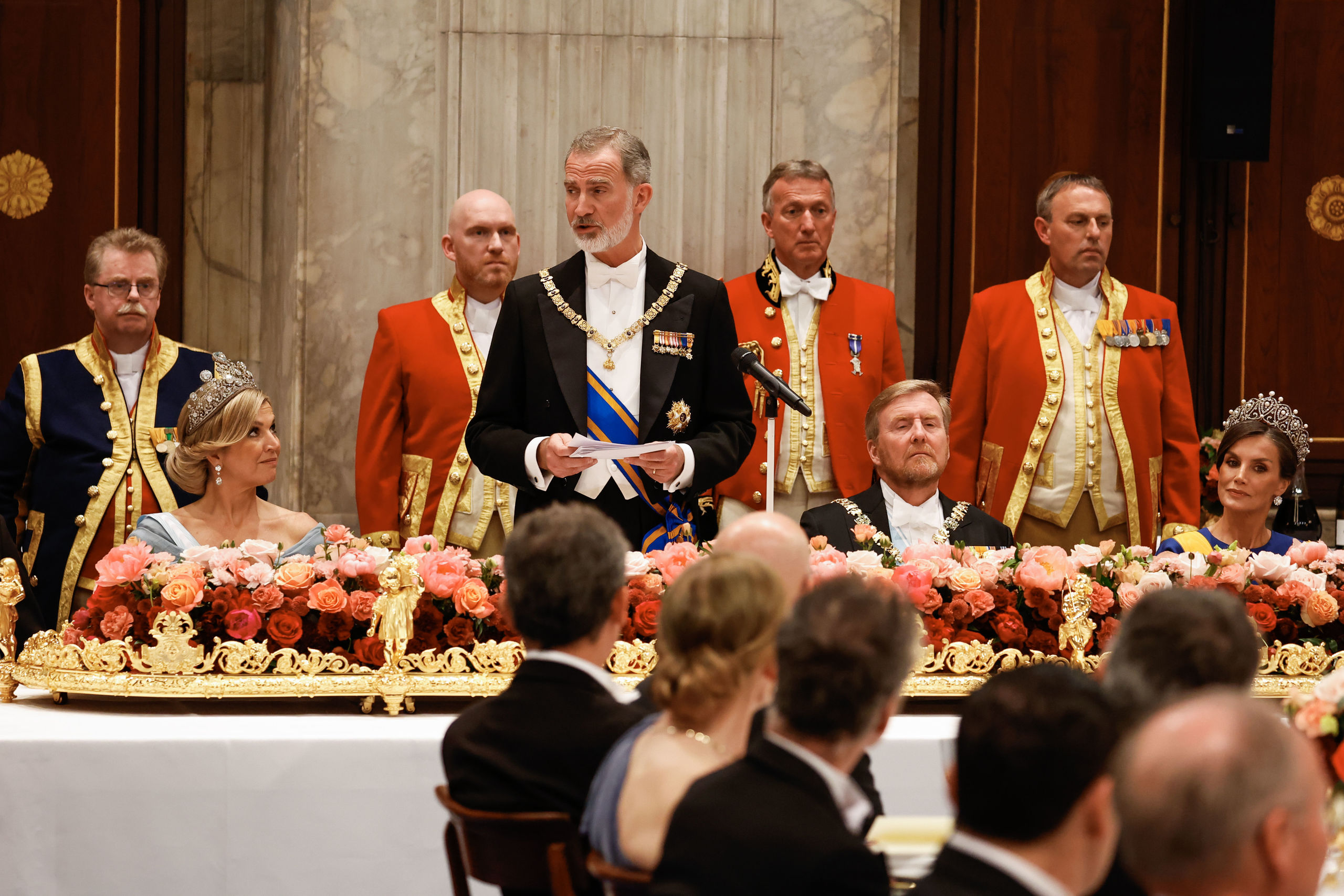 La dolencia que la reina Letizia sufre en su pie izquierdo, conocida como neuroma de Morton, le obligó a protagonizar una imagen insólita al participar sentada en el besamanos previo a la cena. El saludo a los cerca de 220 invitados al banquete tuvo una duración de unos 45 minutos y la Reina optó por sentarse, mientras que Felipe VI y los reyes Guillermo y Máxima permanecieron de pie. Es la primera ocasión en la que la Reina tiene que sentarse en un acto de estas características a causa de su dolencia. También estaba ya sentada al entrar los reyes de Holanda y Felipe VI en el salón del banquete.