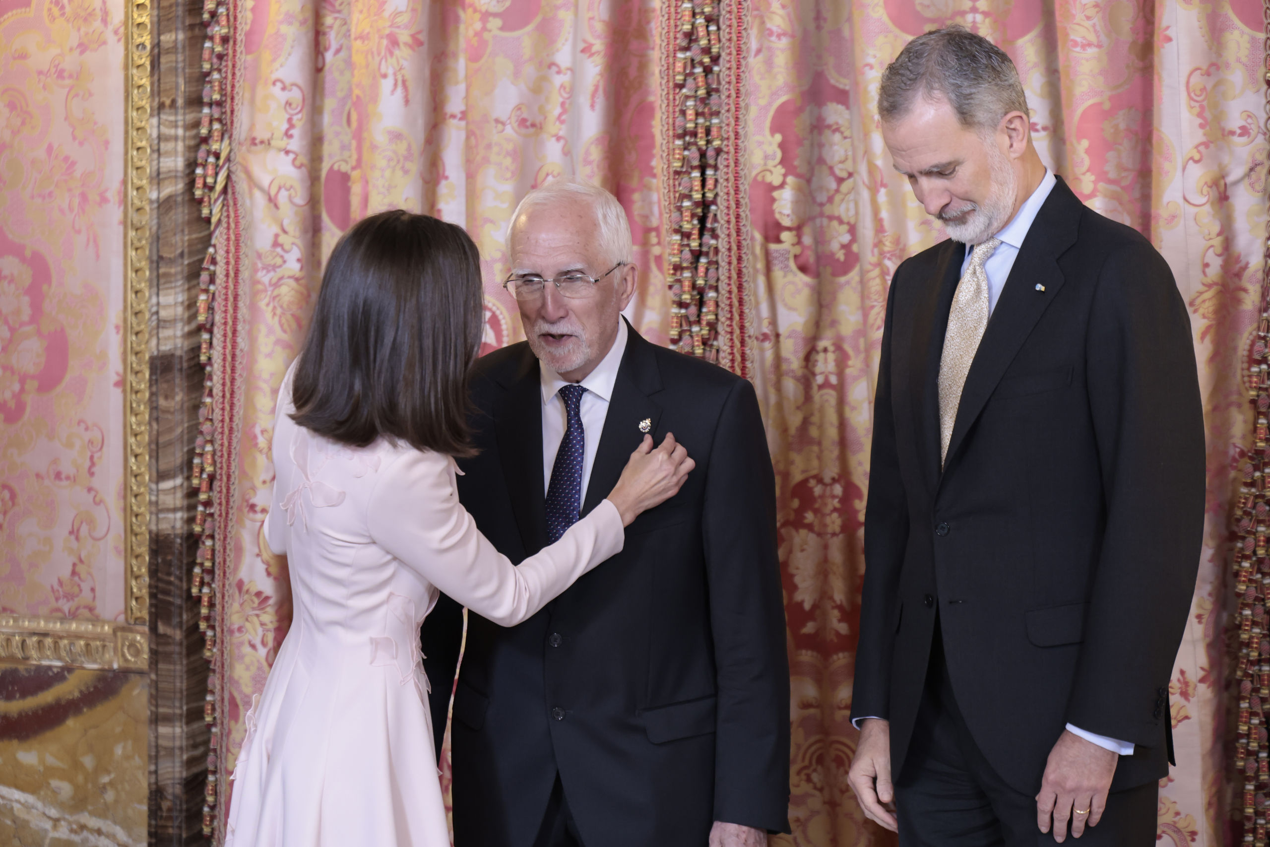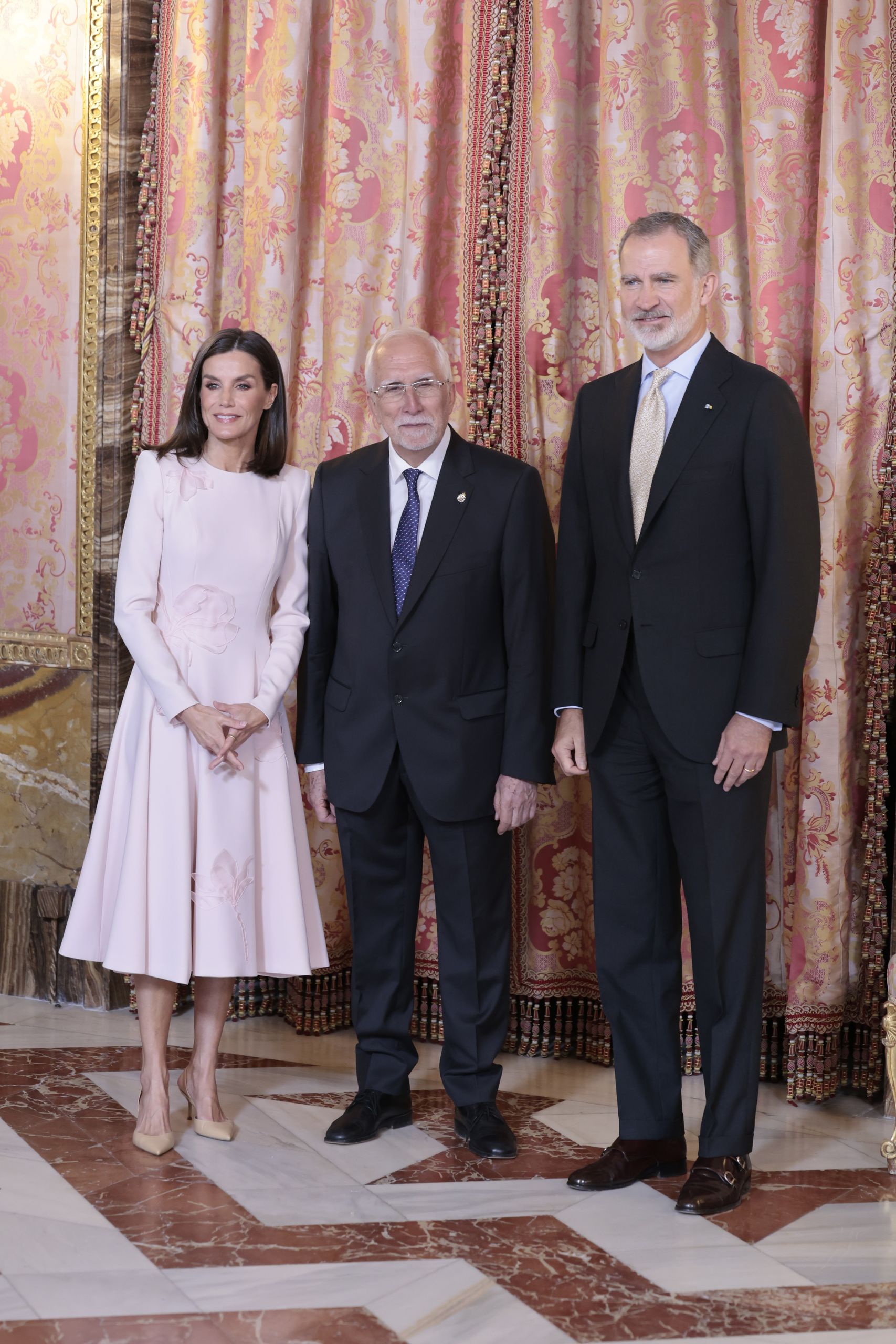Felipe VI y doña Letizia ofrecieron este miércoles en el Palacio Real de Madrid el tradicional almuerzo en honor al escritor español Luis Mateo Díaz, galardonado con el ‘Premio de Literatura en Lengua Castellana Miguel de Cervantes’.