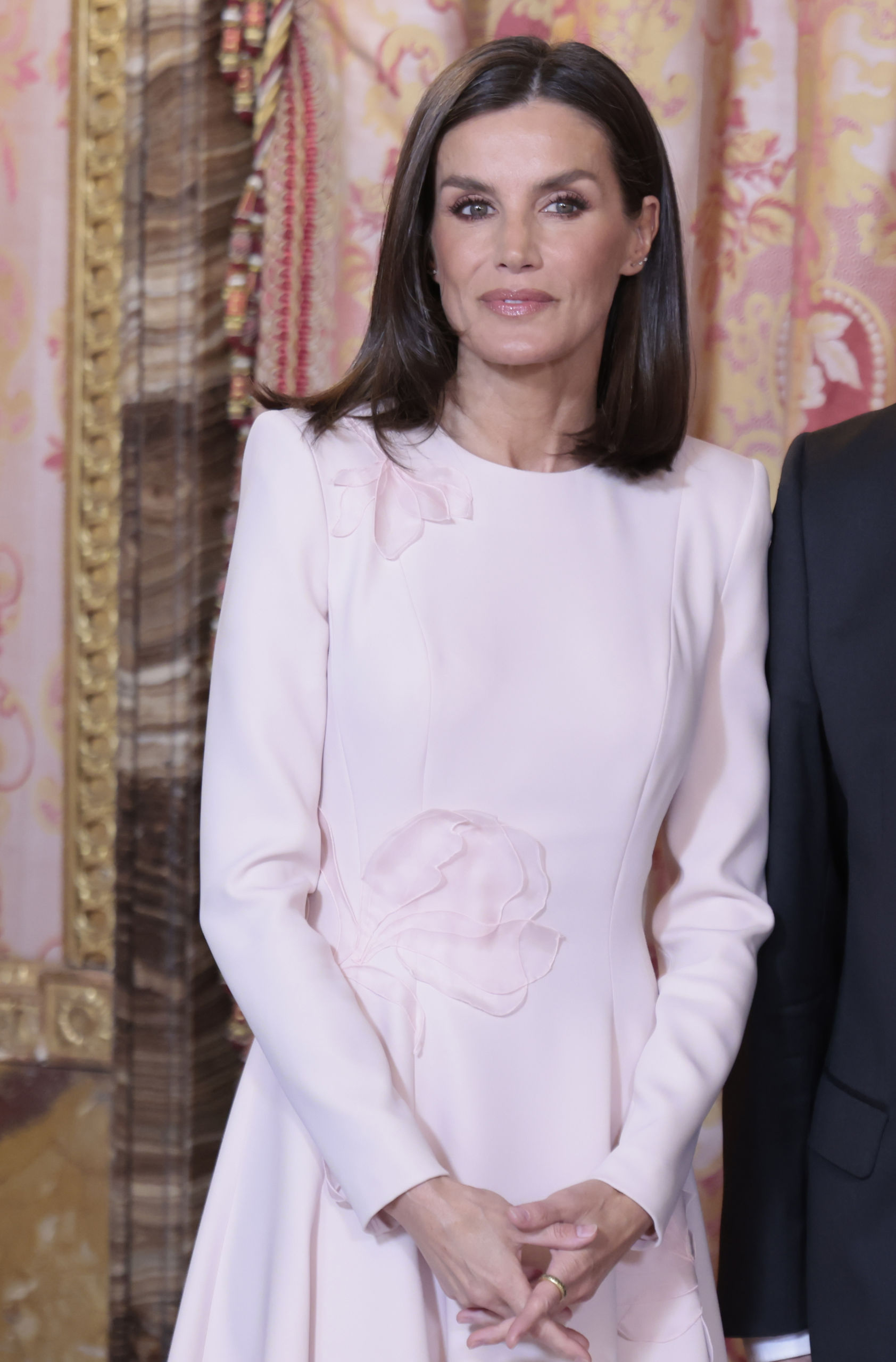 Se trata de un diseño exclusivo para la Reina realizado en crepé rosa con cuello caja, manga larga y cintura ceñida y en el que destacan unas ideales flores en 3D distribuidas por el vestido. Visiblemente recuperada del dolor que le provocó el neuroma de Morton en la visita a Países Bajos, doña Letizia volvió a apostar por un tacón sensato con los destalonados en color nude de Carolina Herrera.