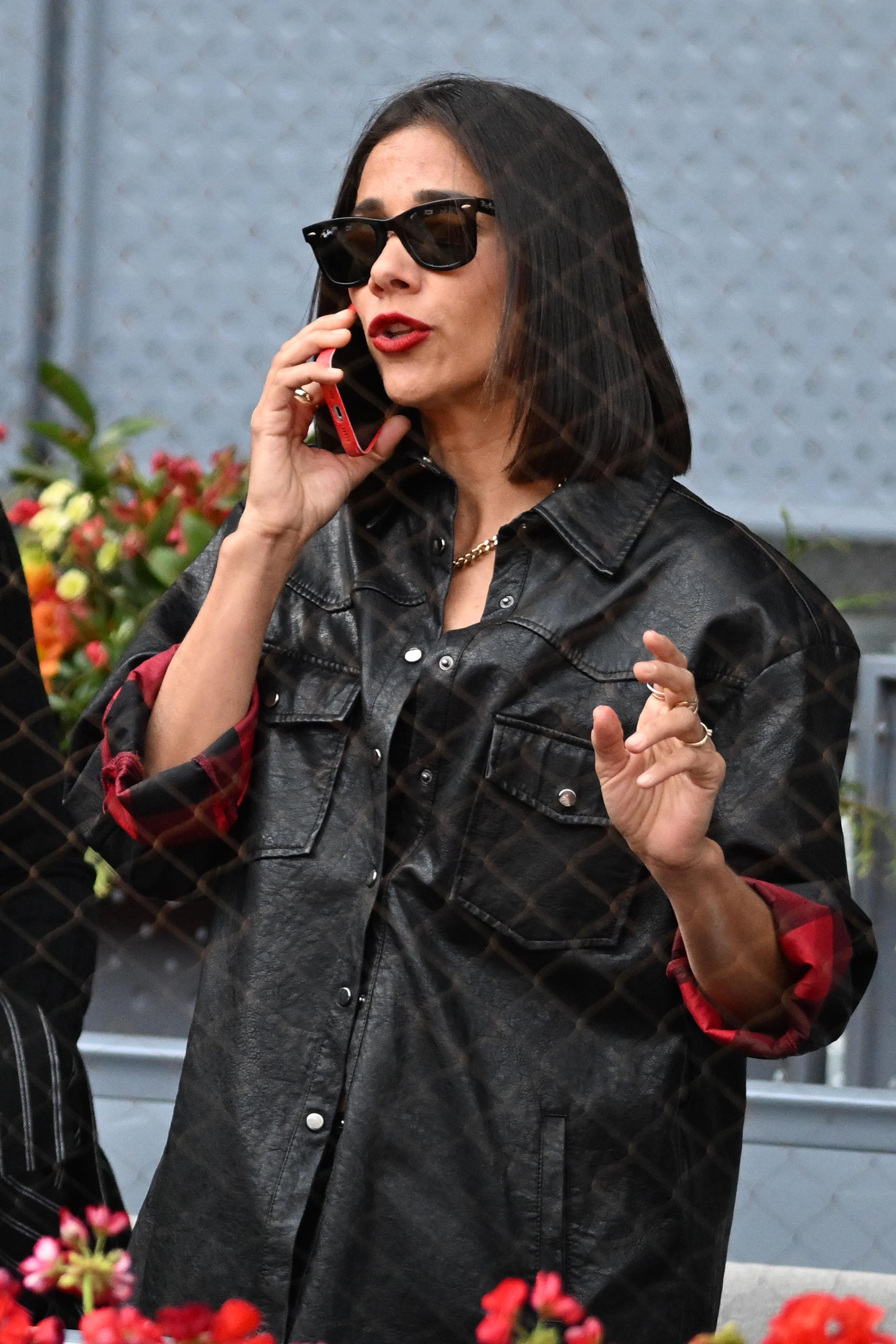 Hiba Abouk y Alejandro Sanz, combinados con blazers de color crudo y cómplices, presenciando el partido de Rafa Nadal.