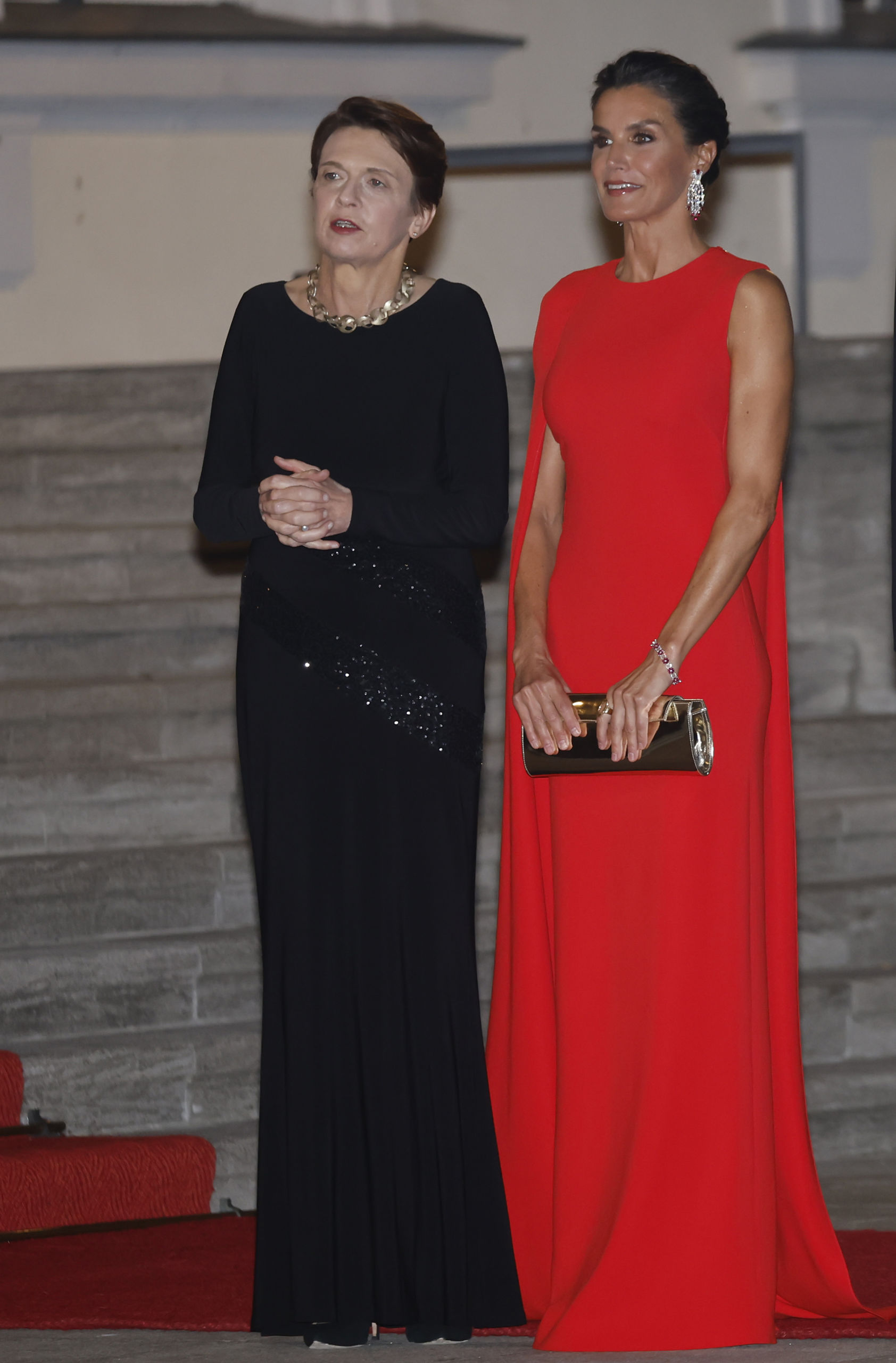 Durante ese mismo viaje lució uno de sus looks más espectaculares: un elegantísimo vestido rojo con capa de Stella McCartney que ya habíamos visto en 2017 con motivo de los festejos por el 50 cumpleaños de Guillermo de los Países Bajos. Del vestido destaca su elegante capa, el escote redondo con manga asimétrica y la silueta lápiz.