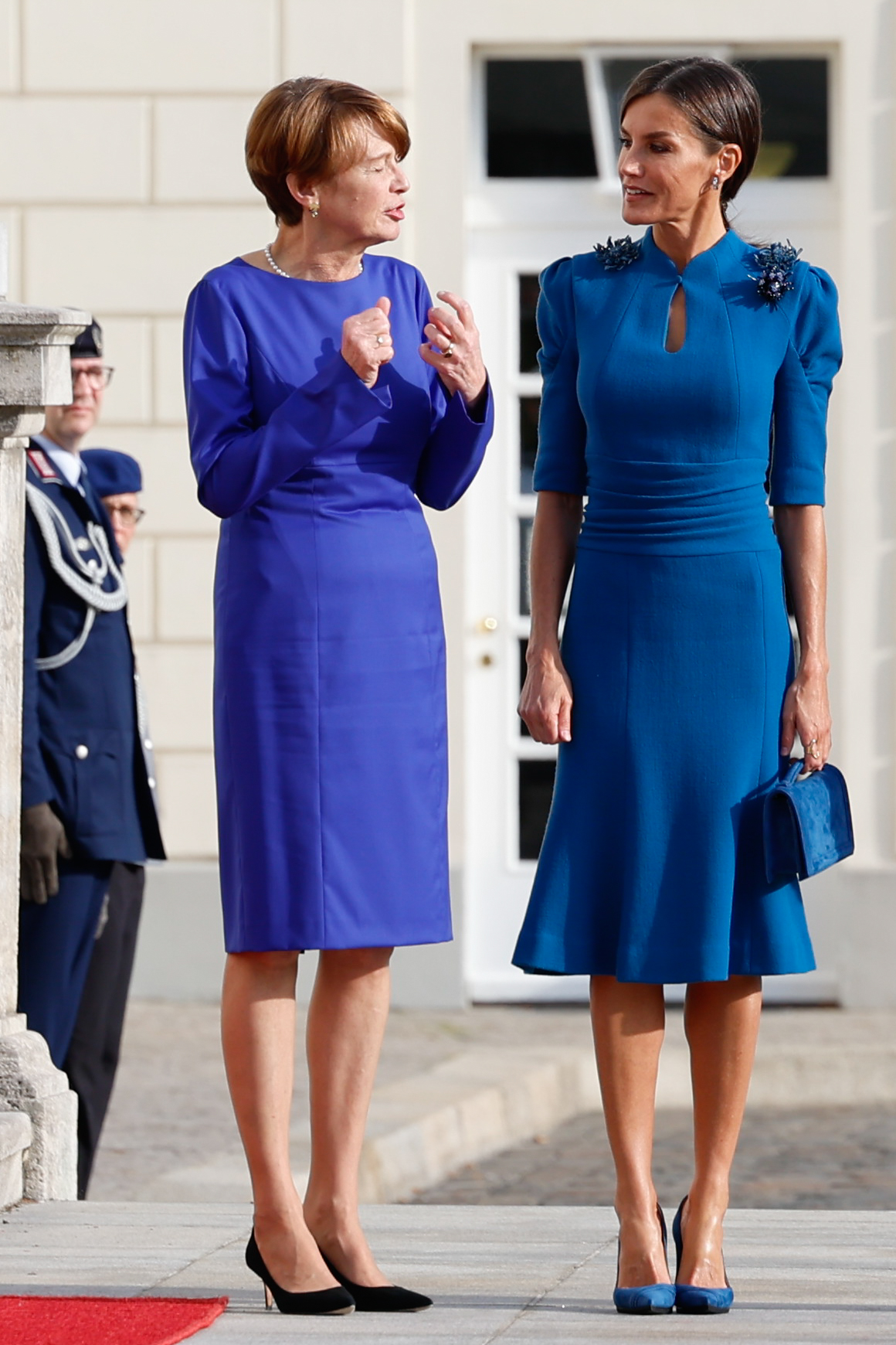 Durante el viaje de Estado que los Reyes realizaron a Alemania en 2022, doña Letizia decidió lucir por primera vez en un acto público un diseño de Carolina Herrera que pertenece a la colección otoño/invierno 2013. Aunque se podría pensar que con los años pasaría de moda, lo cierto es que fue un acierto total. El vestido de manga corta, cintura con fajín y con falda con vuelo de largo midi está decorado con tres broches de pedrería en los hombros con forma de flor.