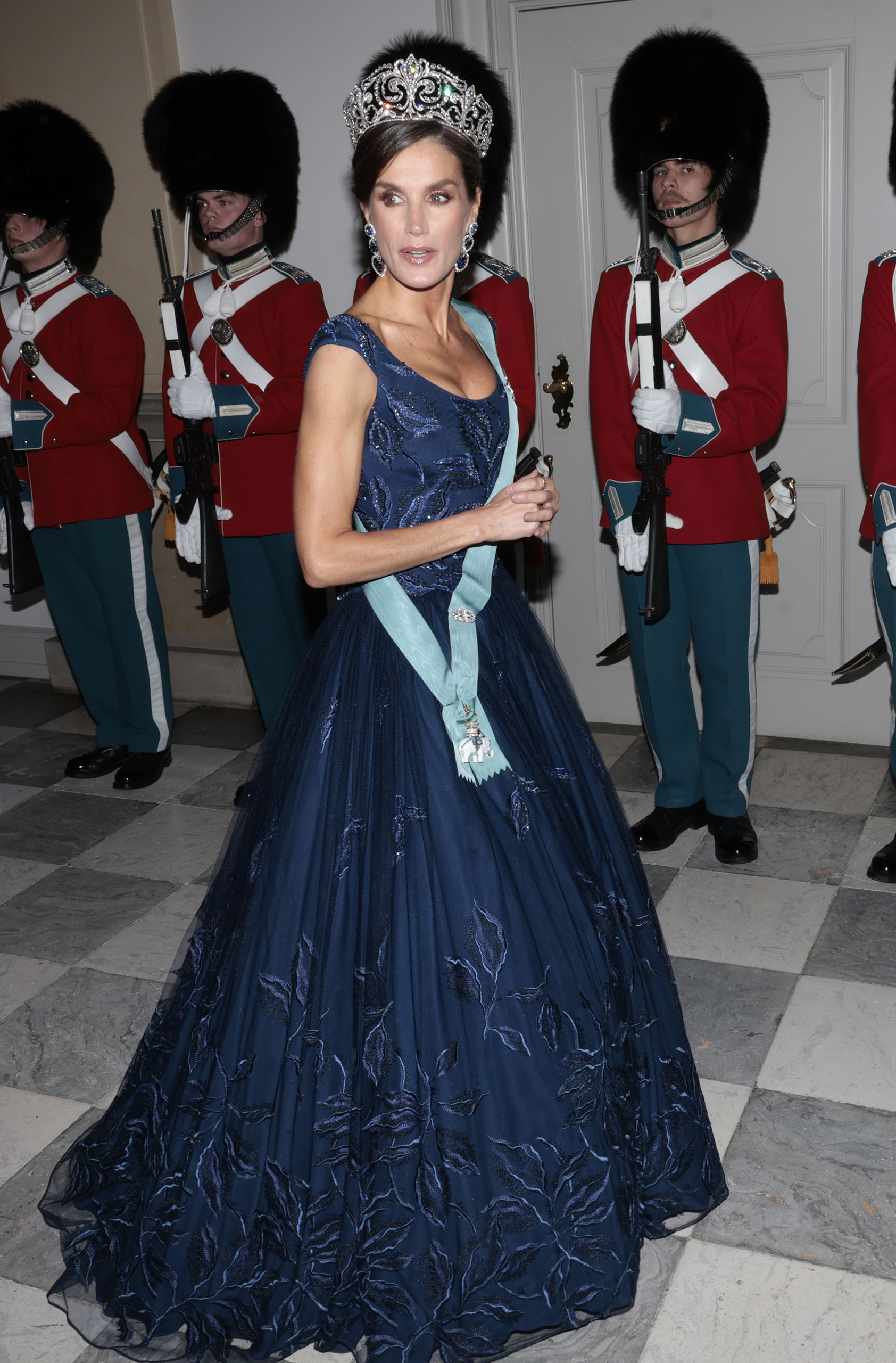 Uno de sus últimos vestidos de gala fue el que lució durante la visita de Estado a Dinamarca en 2023. Se trata de un Felipe Varela que ha lucido en grandes ocasiones. La primera en 2015, cuando lo estrenó para la cena de gala ofrecida al entonces presidente de Perú, Ollanta Humala, en el Palacio Real. La segunda vez que lo lució fue para la visita de Estado a Japón en 2017. Se trata de un diseño creado en tul azul noche con bordados de hojas en hilo y cristal marino, prusia y zafiro.