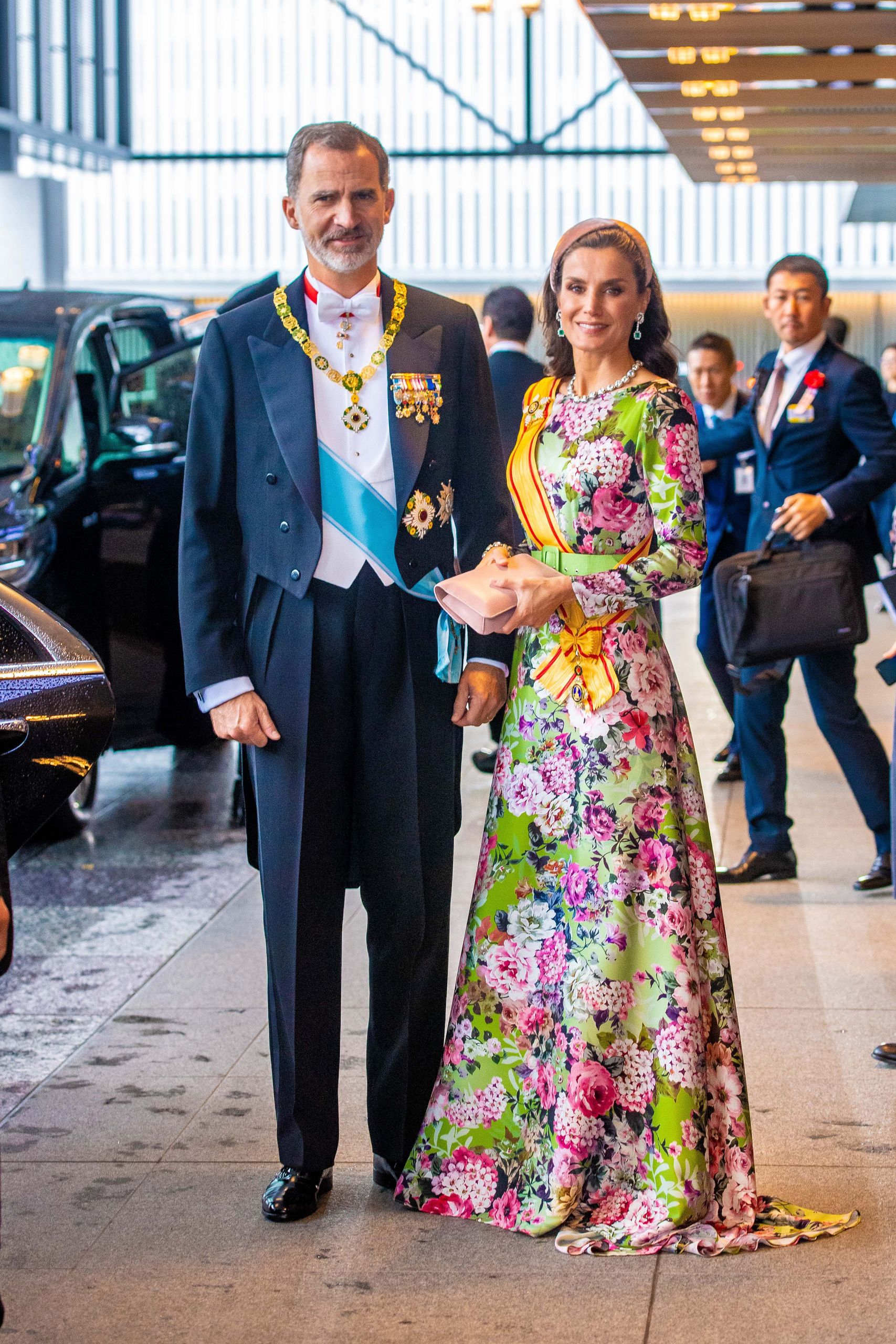Para la entronación de Naruhito, emperador de Japón, en 2019 doña Letizia dio un giro a sus estilismos de largo con un acertadísimo vestido de la cordobesa Matilde Cano diseñado en seda estampada que recuerda a los tejidos de los kimonos japoneses.