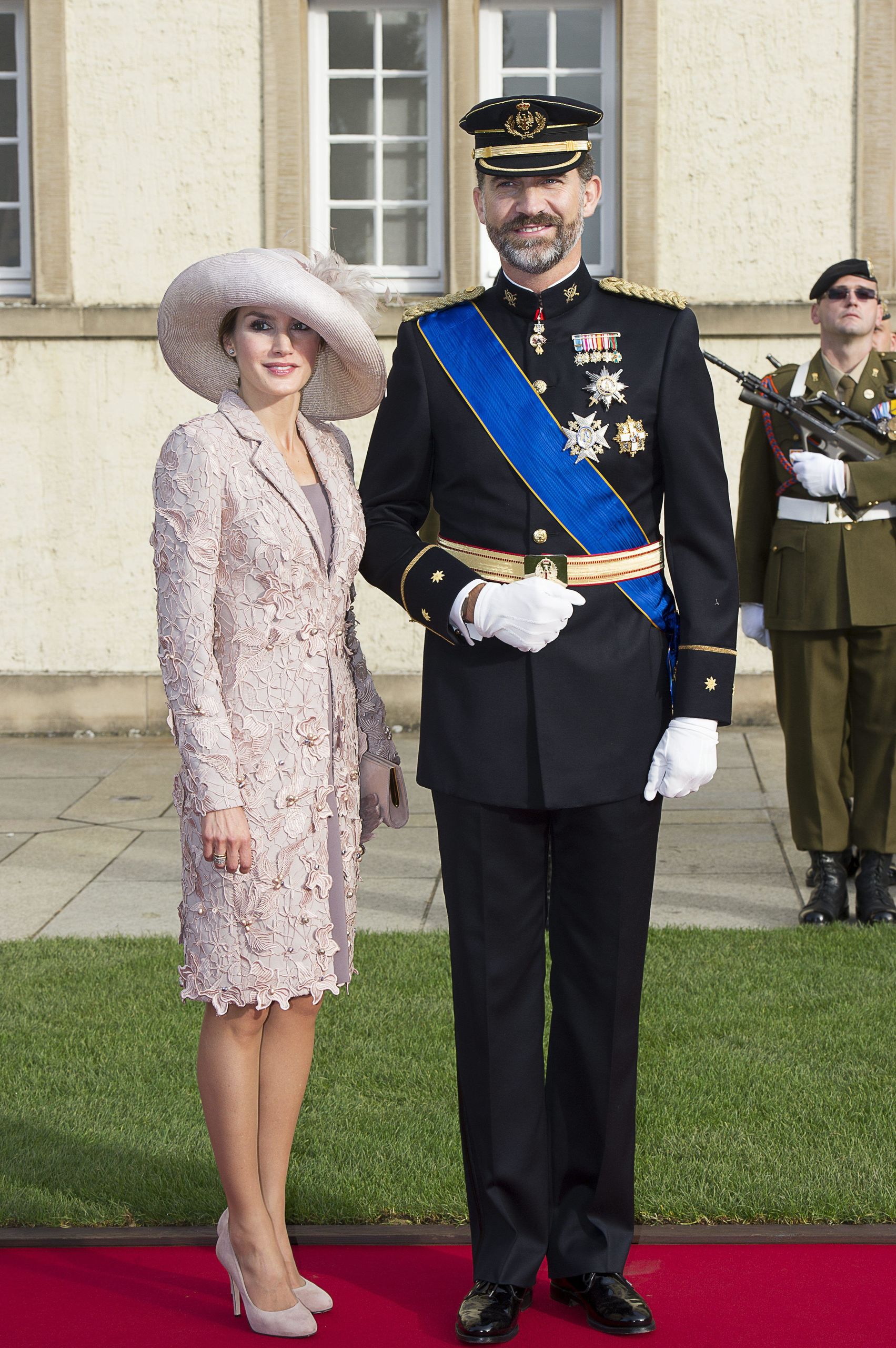 Para la boda de los príncipes de Luxemburgo en 2012, la princesa de Asturias apostó por su fiel Felipe Varela con un look muy en tendencia aquel año. Se trata de un dos piezas en color beige a juego con una pamela de paja italiana con el ala levantada y un aderezo de plumas de los diseñadores Pablo y Mayaya .