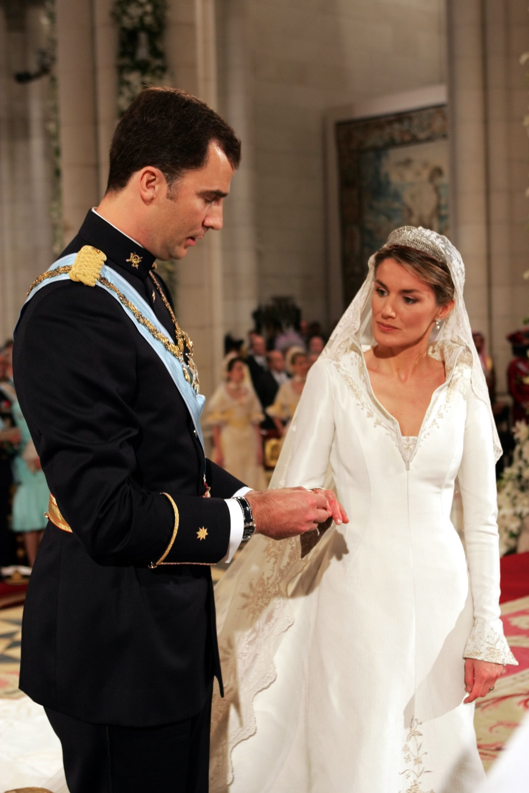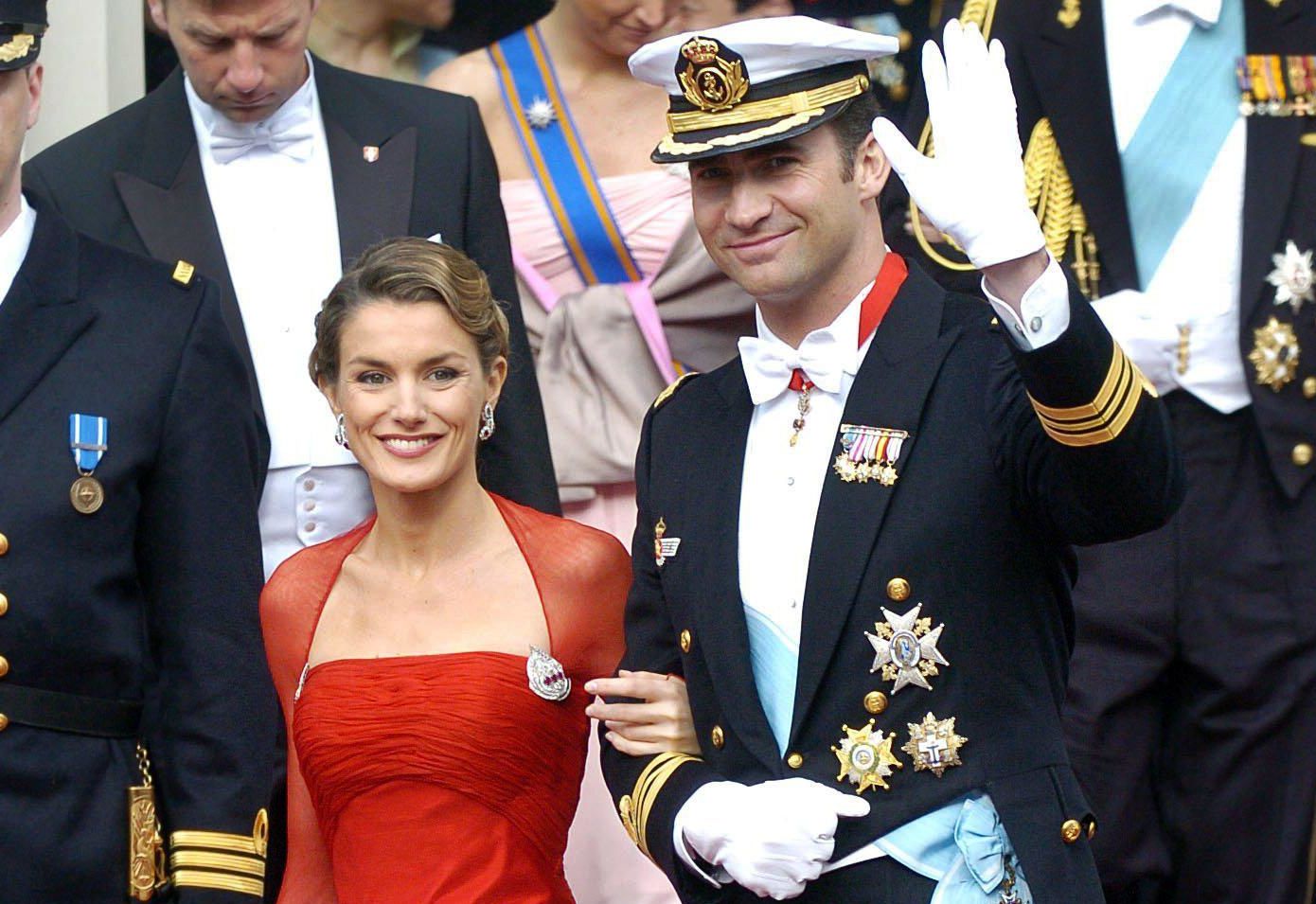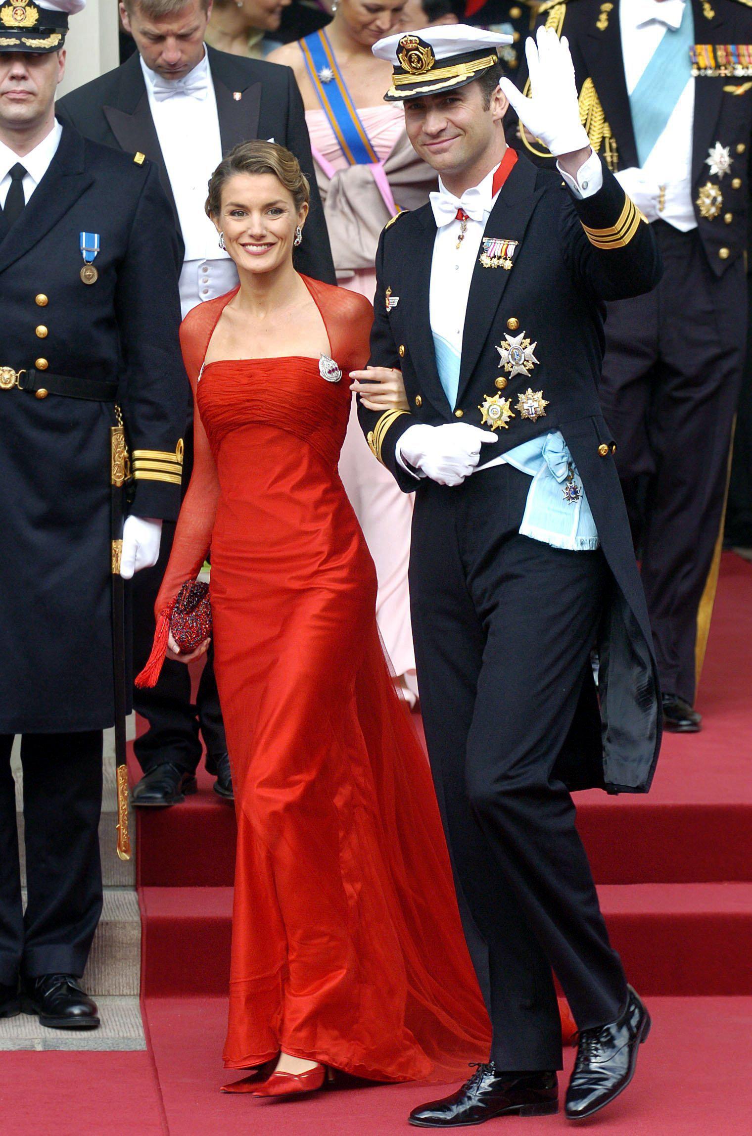 Tan solo una semana después, el 22 de mayo de 2004, llegó el turno de la boda de los entonces príncipes de Asturias, un evento al que asistieron 1400 invitados y siguieron 25.145.000 espectadores por televisión. El vestido fue diseñado por Manuel Pertegaz y estaba confeccionado con seda valenciana de Rafael Catalá. Un diseño clásico cuyo cuello chimenea con bordados en hilo de plata y oro fue lo que más debate generó. Terminado en una cola decorada de 4,5 metros de largo y un perímetro de 16 metros, hoy en día se puede ver de cerca ya que está expuesto de forma permanente en el Palacio Real de Aranjuez.
