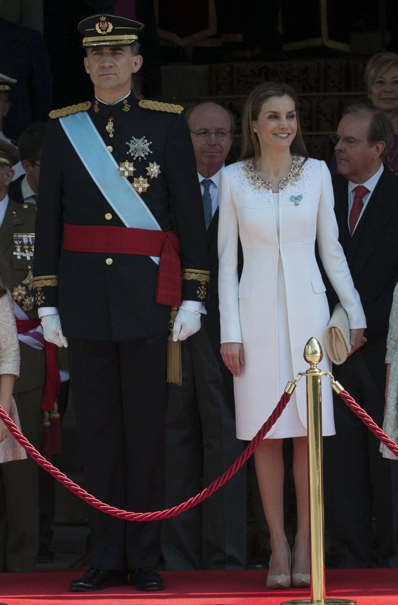 Cuando están a punto de cumplirse 10 años de la proclamación de Felipe VI como Rey, recordamos la elegancia que derrochó la nueva reina de los españoles en una cita histórica. Tras años de relación distanciada, Felipe Varela volvió a vestir a doña Letizia con un abrigo blanco hecho a medida donde destacaba el bordado de pedrería multicolor en el cuello. Para seguir con la armonía del blanco, debajo lució un vestido del mismo diseñador del largo exacto del abrigo.