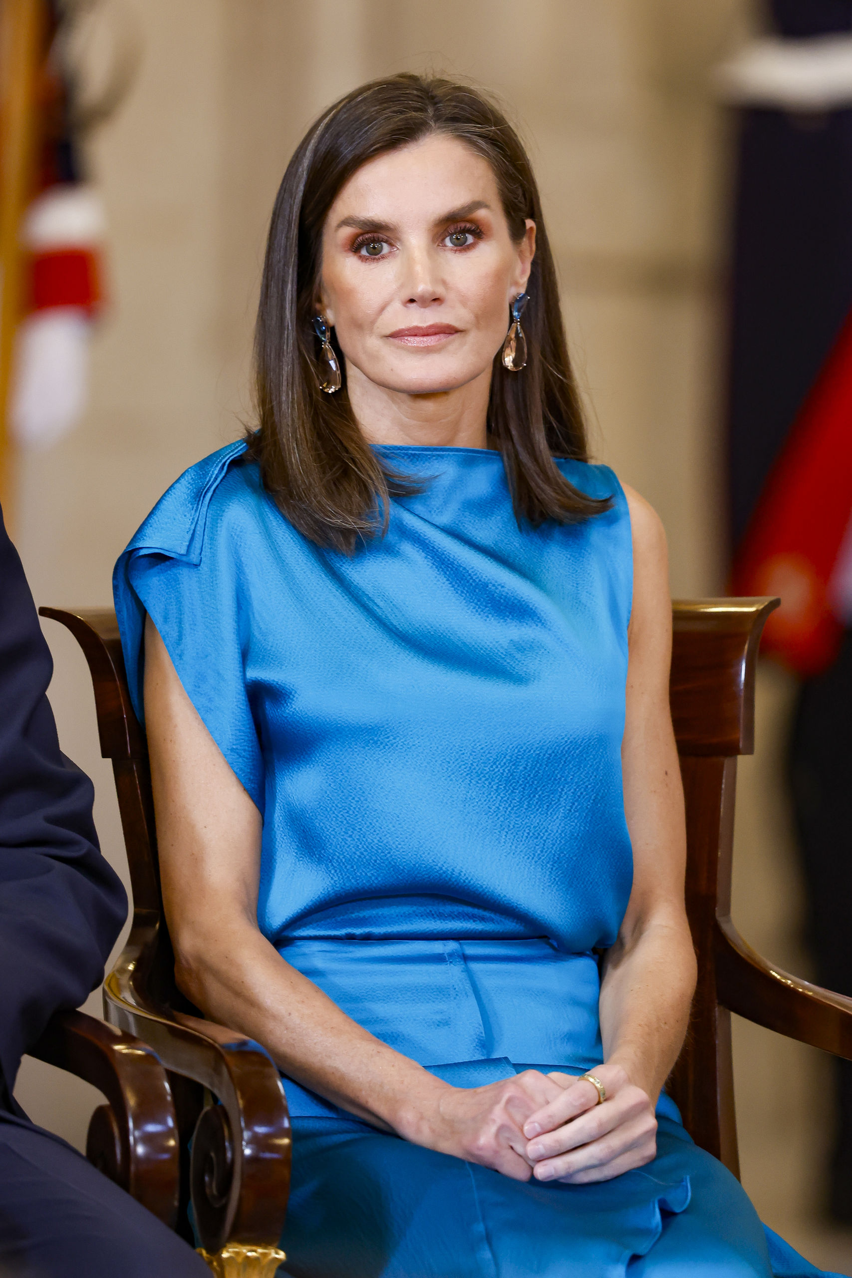 Como suele hacer en las citas especiales, la reina Letizia ha dejado brillar a su hija mayor, optando por lucir un conjunto satinado en color azul pavo real que llevó en los premios Mariano de Cavia. Se trata de un conjunto de Maksu confeccionado 100% en seda natural, con falda de estilo midi estilo pareo, y en la parte superior superior, un top asimétrico sin mangas. Sin duda, una elección muy veraniega por parte de la Reina, que se aleja por completo de los trajes que ha llevado en las últimas semanas.