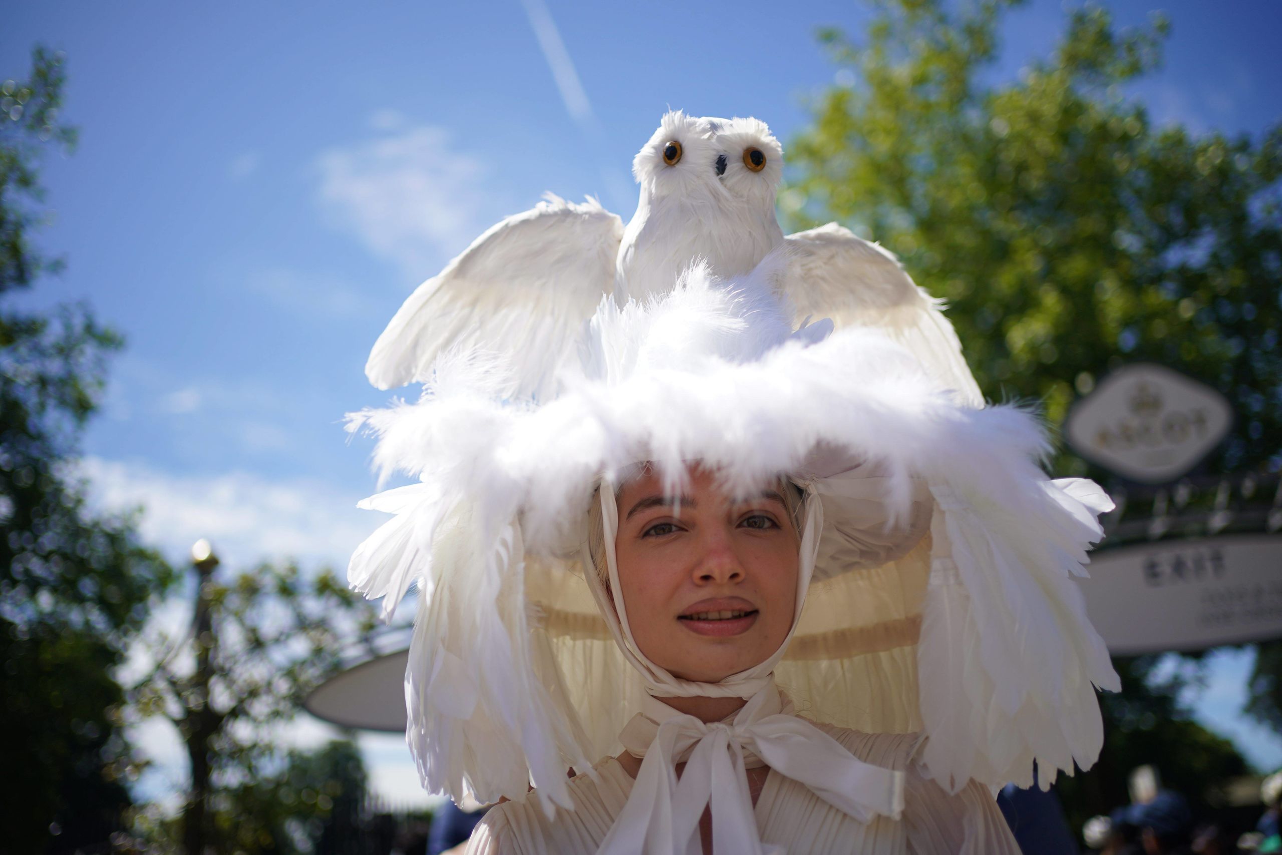 La modelo Angelina Chebotareva Rockefeller quiso realizar un homenaje a Hedwig, la lechuza de Harry Potter con este sombrero de plumas blancas hecho por ella misma. Sus complementos de Chane y Jimmy Choo, quedaban eclipsados por este extravagante sombrero.