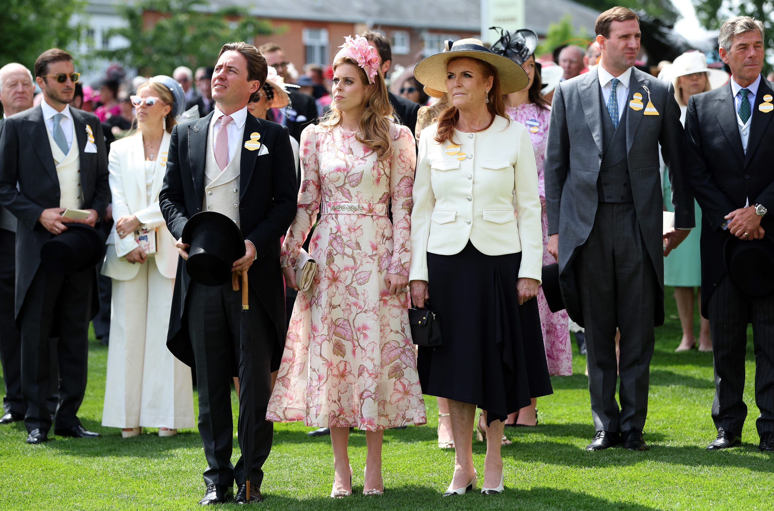 Sarah Ferguson, con falda midi negra y chaqueta entallada en color blanco de Veronica Beard, ha asistido con su hija, a princesa Beatriz de York, muy elegante con vestido blanco de estampado floral en tonos rosas de Zimmermann, zapatos satinados en blanco con clutch a juego de Roger Vivier y tocado de Juliette Millinery; y su marido Edoardo Mapelli Mozzi