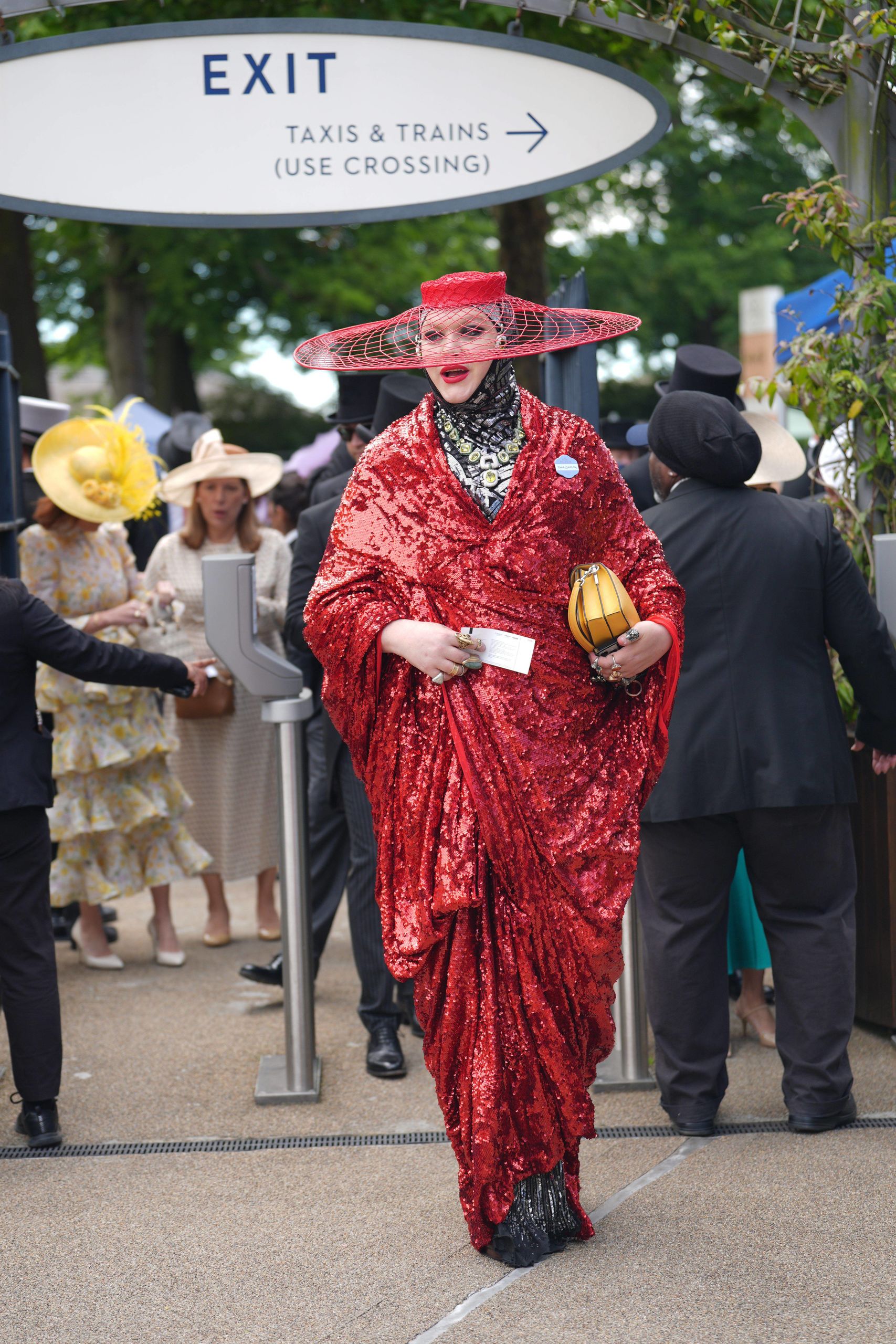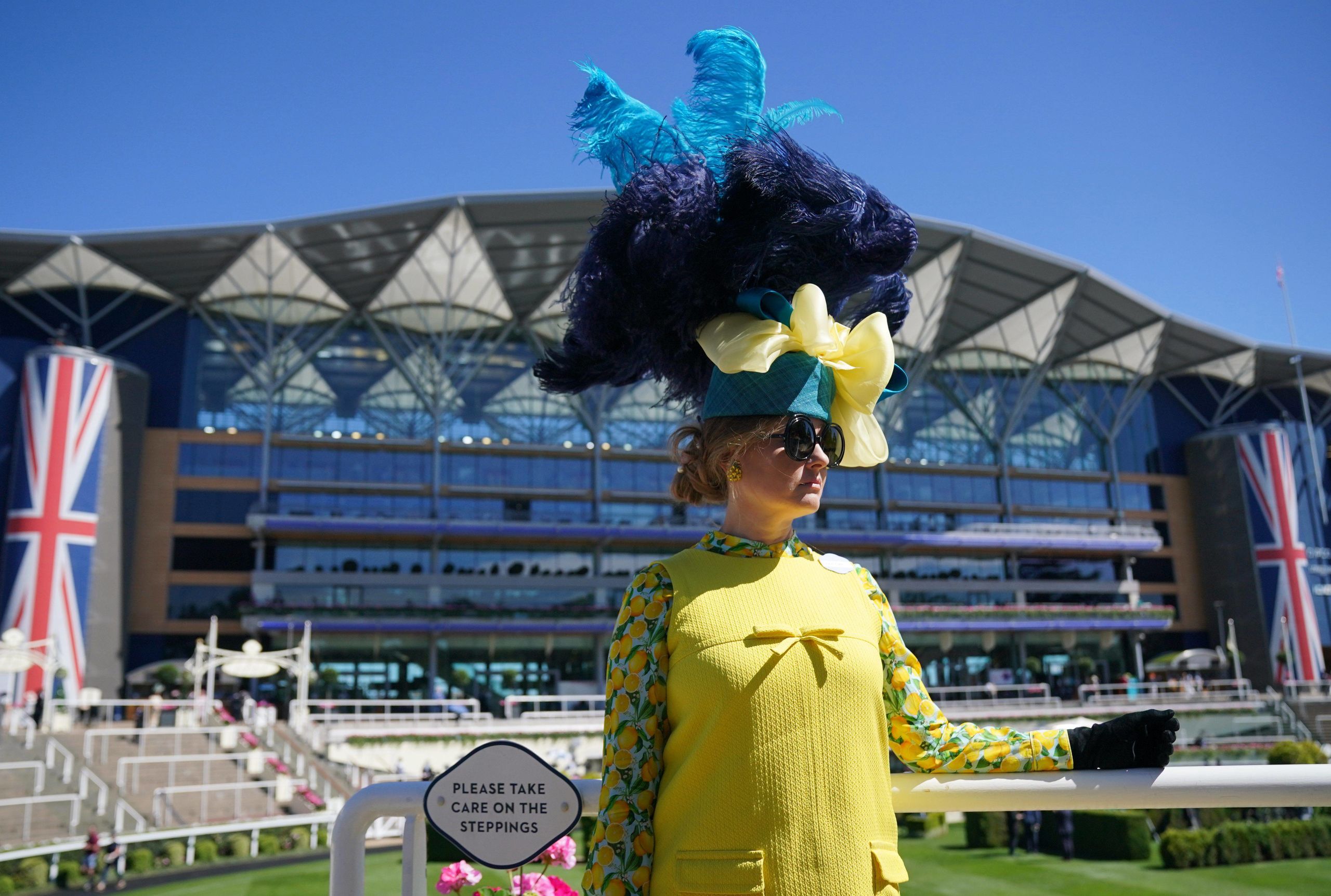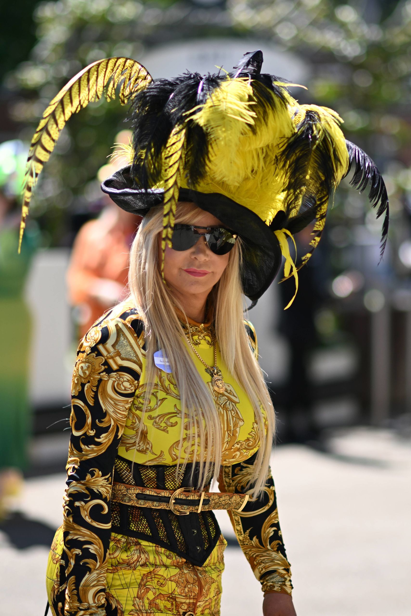 Una asistente a Royal Ascot con un look de estampado medusa de Versace un pelín desfasado, con medallon incluido, que recuerda a la Marbella de los años del saqueo y el expolio, con sombrero de plumas negra y amarilla.